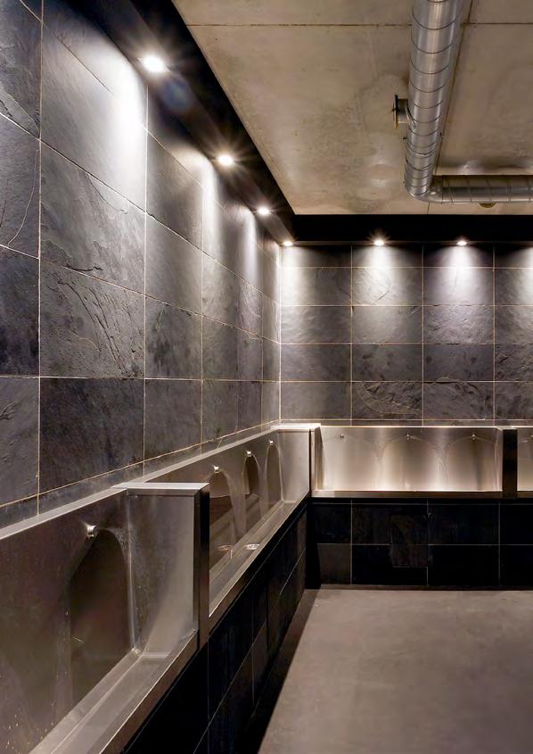 Une solution sur mesure pour équiper les sanitaires du stadium de Toulouse, avec des urinoirs collectifs supendus et des lavabos rigoles avec un design spécifique.