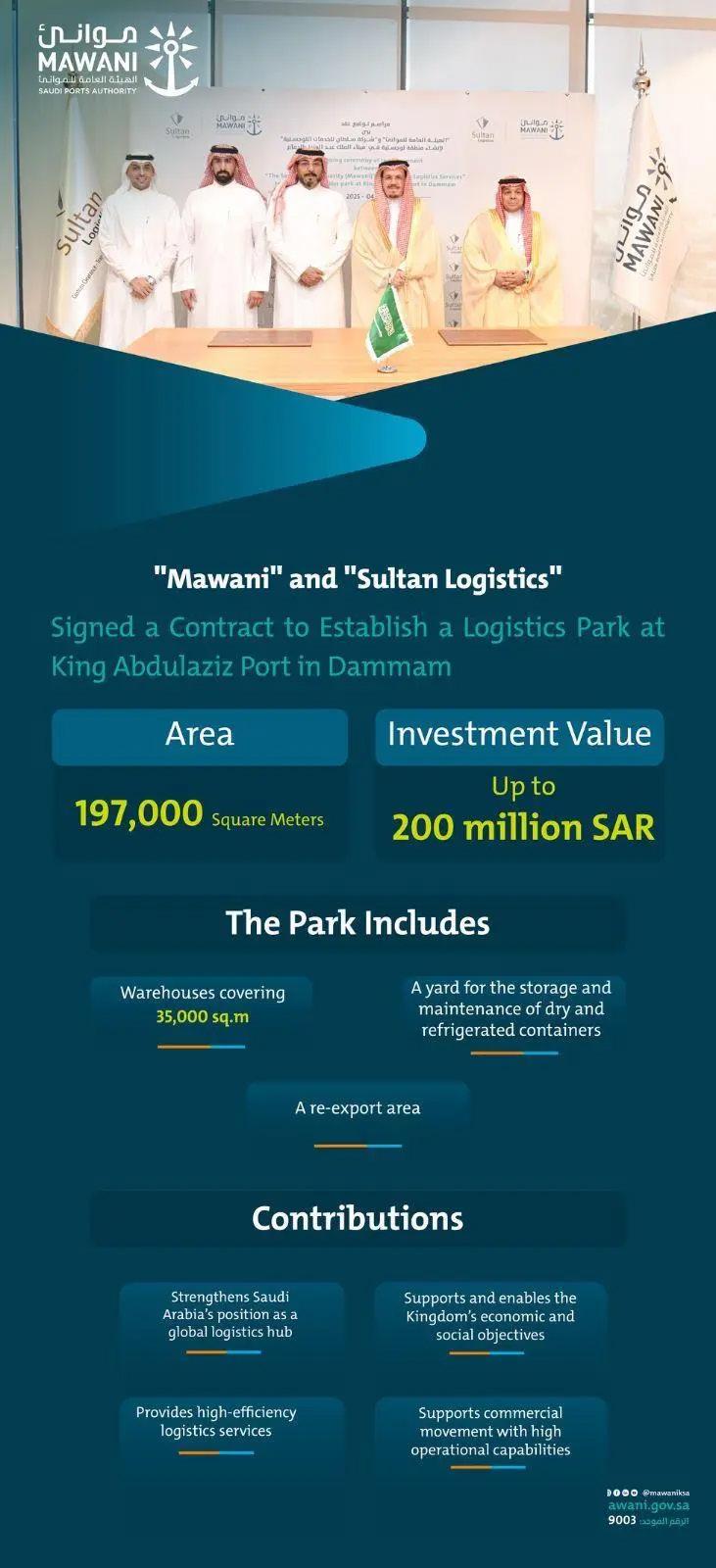 The Saudi Ports Authority (Mawani) and Sultan Logistics have signed a contract to establish a logistics park at King Abdulaziz Port in Dammam, with an investment of up to SAR 200 million. The new park will span an area of 197,000 square meters, aiming to enhance the port’s competitiveness, increase its operational efficiency, and elevate the level of logistics services provided.