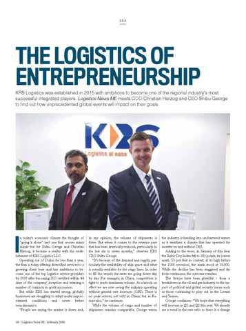 n today’s economic climate the thought of “going it alone” isn’t one that crosses many minds but for Shibu George and Christian Herzog, it became a reality with the establishment of KRS Logistics LLC. Operating out of Dubai for less than a year, the firm is today offering diversified services to a growing client base and has ambitions to become one of the top logistics service providers by 2020 after becoming ISO certified within 44 days of the company’ inception and winning a number of contracts in quick succession. But while KRS has started strong, globally businesses are struggling to adapt under unprecedented conditions and never before seen dynamics. “People are saying the market is down and,