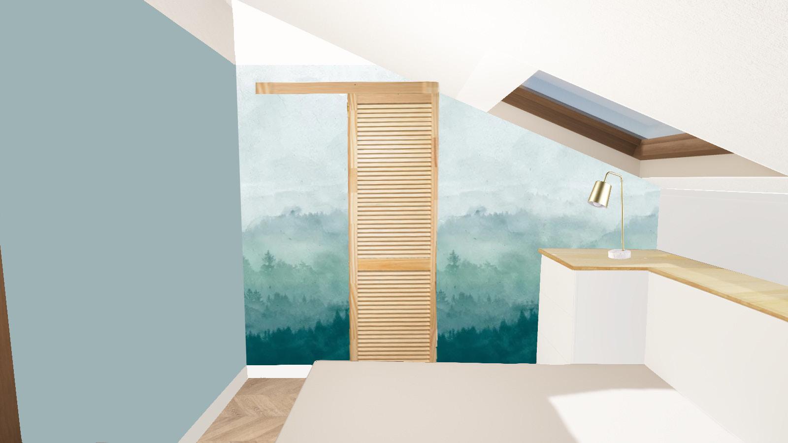 J’ai placé la tête de lit du côté de la pente pour permettre de créer un passage jusqu’à la salle d’eau. Le couple souhaitait également une chambre «les faisant voyager». La ville qui leur tenait à cœur était Annecy. Je leur ai alors proposé de mettre un papier peint avec un motif de montagne et des peintures sur les nuances de bleu, le tout combiné avec un matériau naturel, le bois.
