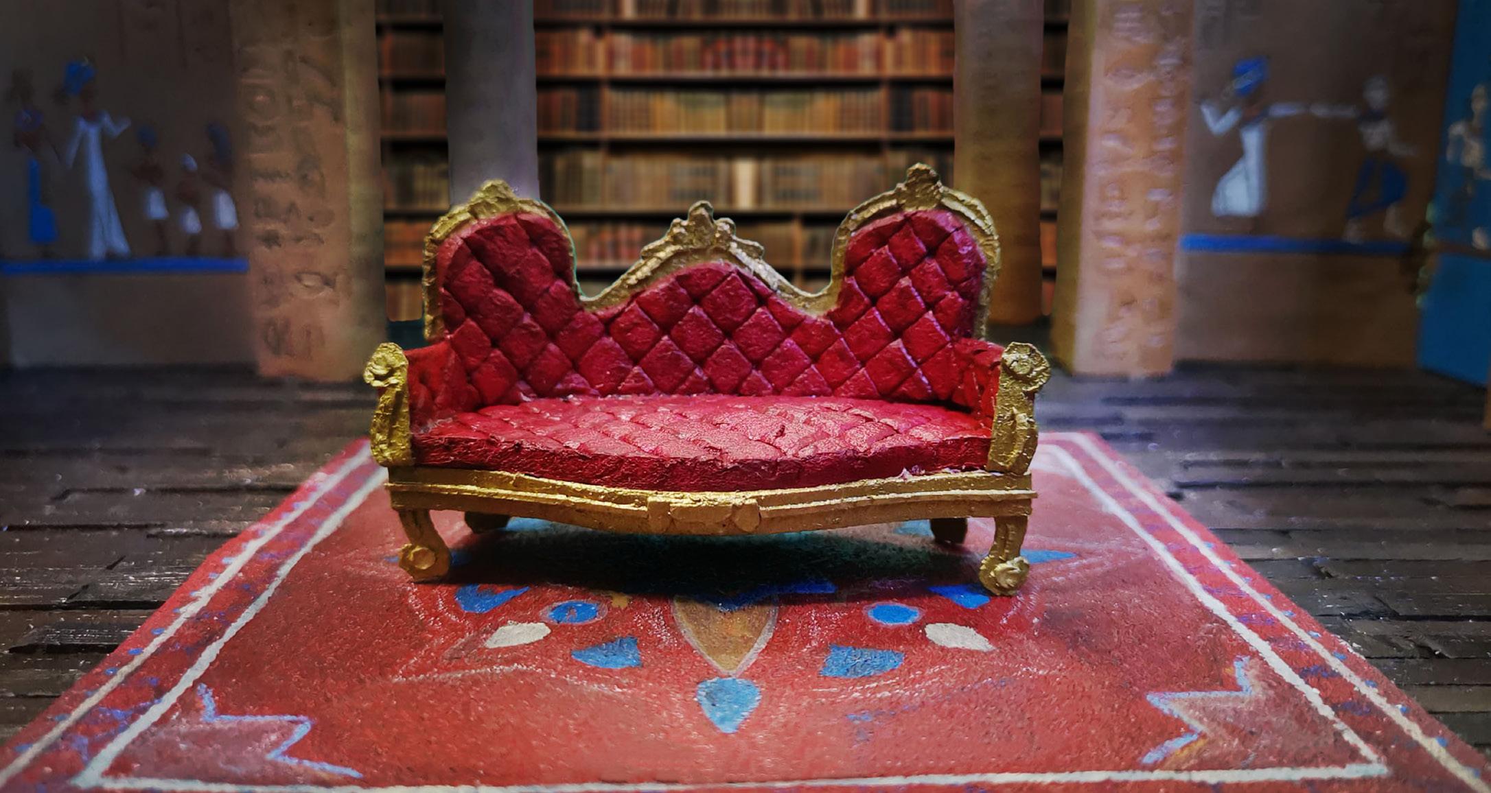 Un canapé se trouvera au centre de la pièce sur une tournette offrant ainsi un point du vue à 360° dans le but de créer un mouvement en arrière plan des personnages. Sur les murs, on pourra lire l’histoire d’Imothep lV comme un hommage à sa vie antérieure.