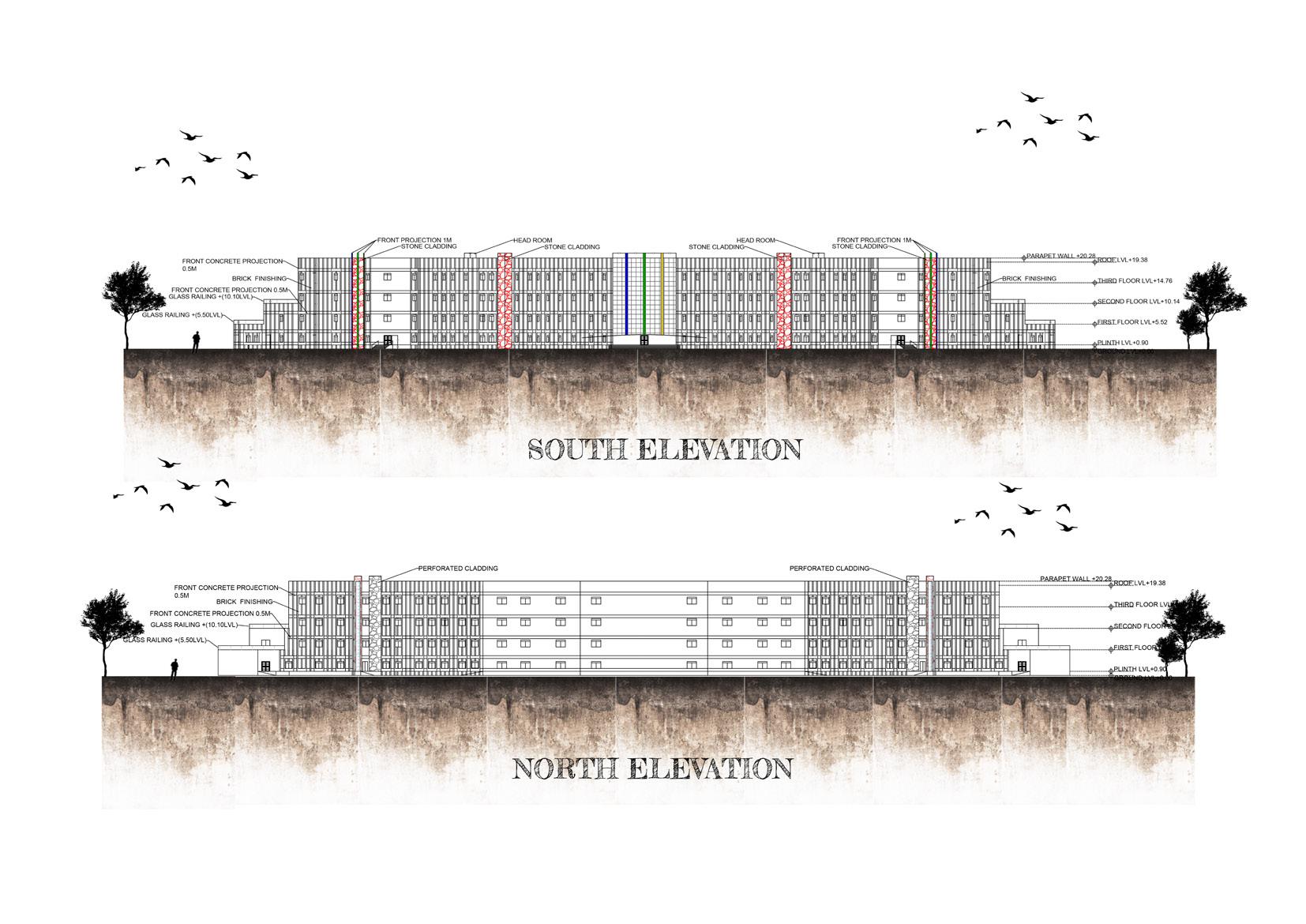 ELEVATION CONSULTATION ROOM OPERATION THEATER ROOMS WARD ROOMS WARD ROOMS PENT HOUSE +1'6" PROJECTION +4.5" PROJECTION TERRACE FLOOR FOURTH FLOOR THIRD FLOOR SECOND FLOOR FIRST FLOOR GROUND FLOOR ROAD LEVEL BASEMENT FLOOR