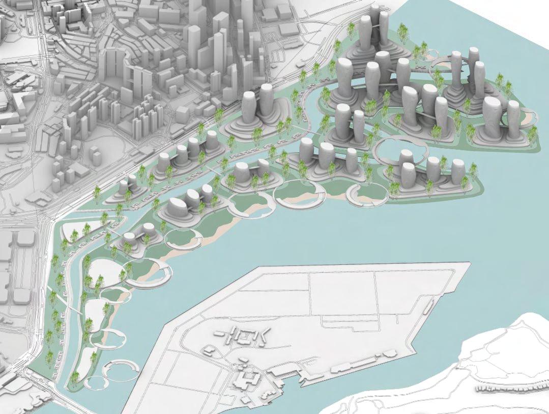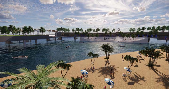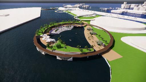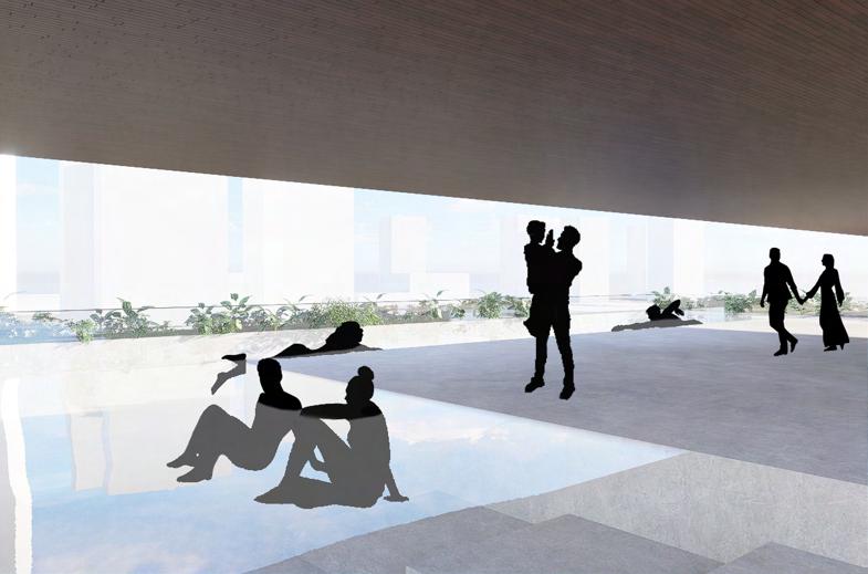 Rather than trying to curb the rising sea level, our proposal aims to instead allow water to envelope the space as the sea level rises through the implementation of hardscape and softscape, creating di erent topographies during low tides, high tides, and as the sea level rises in the short and long term.