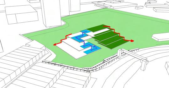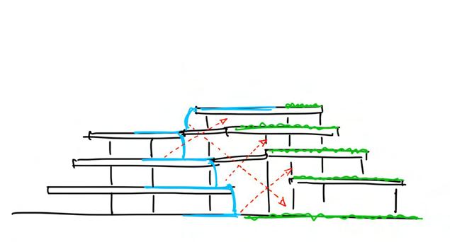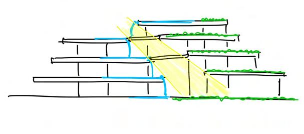 The staggered design not only creates visual interest but also allows for the e cient utilization of space, maximizing opportunities for relaxation and social interaction. By orienting the Cascade to capture optimal views and balance natural light and shade, the design fosters a connection with the outdoors. Additionally, exible spaces and communal areas are strategically placed throughout the Centre to encourage spontaneous interactions and cater to diverse user preferences.