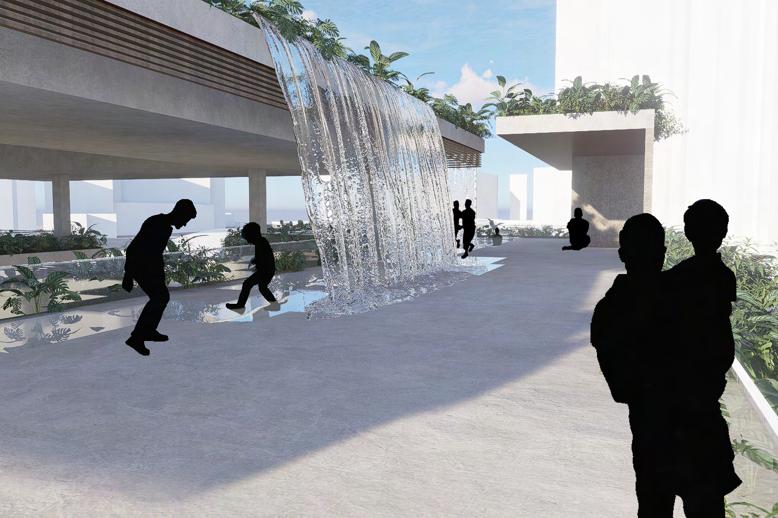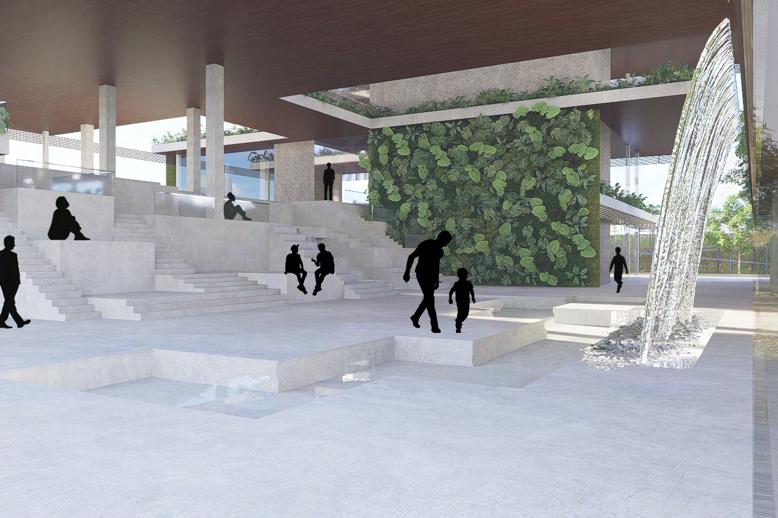 Emphasizing cascading of water and greenery, promoting a calm and multisensory spatial experience