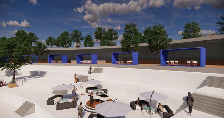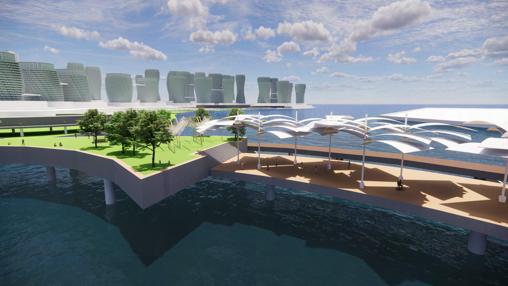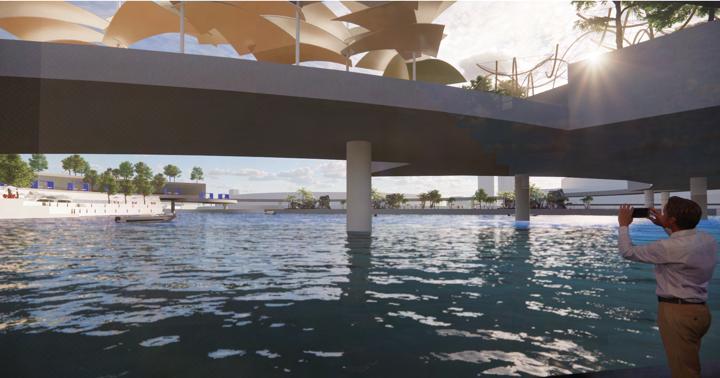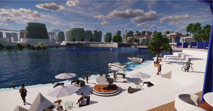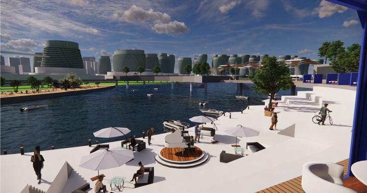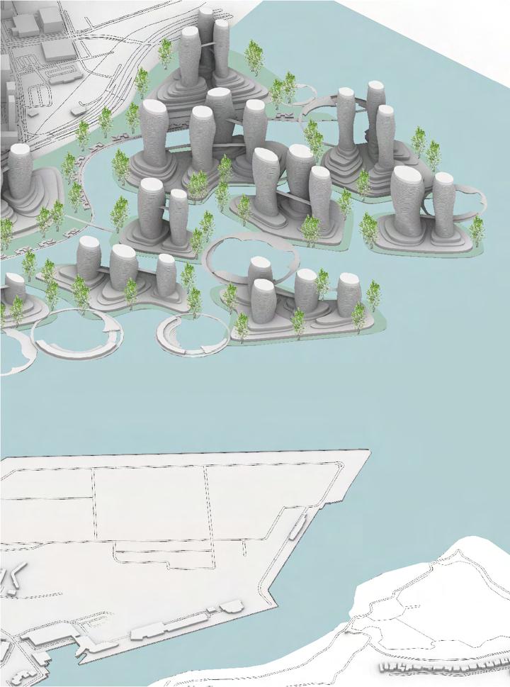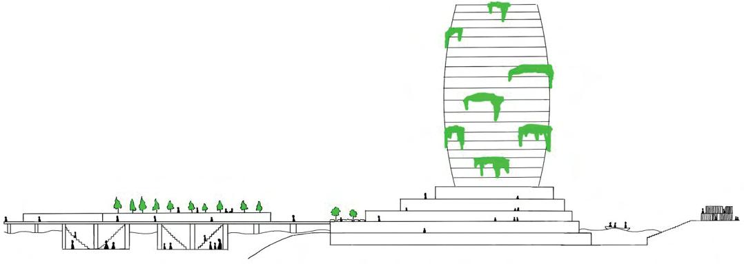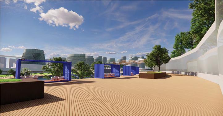 In our proposal, rising sea levels are seen as an opportunity rather than a threat, and our design embraces this by creating spaces that adapts to the rising water levels. The integration of what will be the history of keppel harbour (shipping containers) creates a unique identity for the site and promotes a sense of community among its residents. The design also addresses the need for alternative transportation options as the water level rises to ood the roads, with cycling paths becoming the main mode of transport as the water level rises, which also promotes a car-lite space. and the large ringed promenades act as the rst layer of coastal defense and creates arti cial pockets of calm water near the shore, allowing for a multitude of activities to take place.