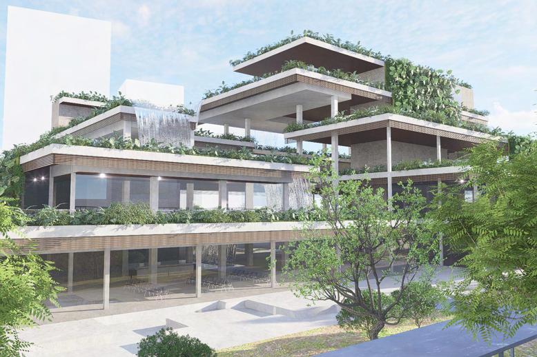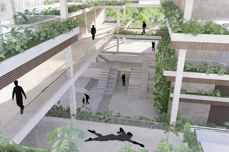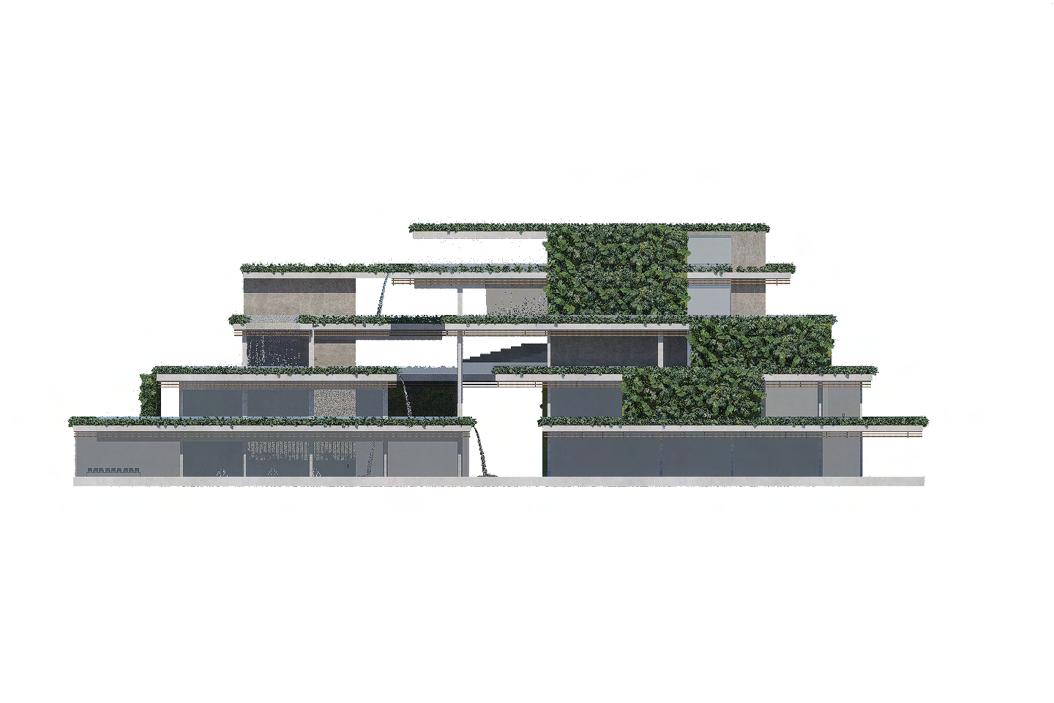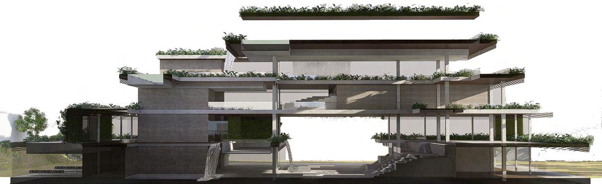 Welcome to the Cascade, where cascading hydro pools and greenery intersect a staggered design, creating a serene oasis. Greenery punctures spaces throughout the building, creating havens for people to unwind and connect. Large planes express strong horizontality, yet staggering of the spaces allows for verticality in terms of visual connectivity, where the design seamlessly weaves panoramic views into the experience of the site.