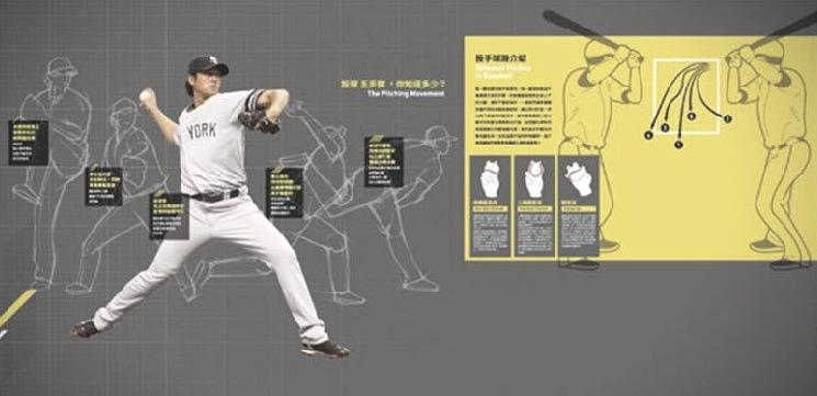 棒球英雄展以四位旅外台籍職業棒球 選⼿陳⾦鋒、王建民、郭泓志,以及 陽岱鋼為主軸,整個展覽以棒球賽九