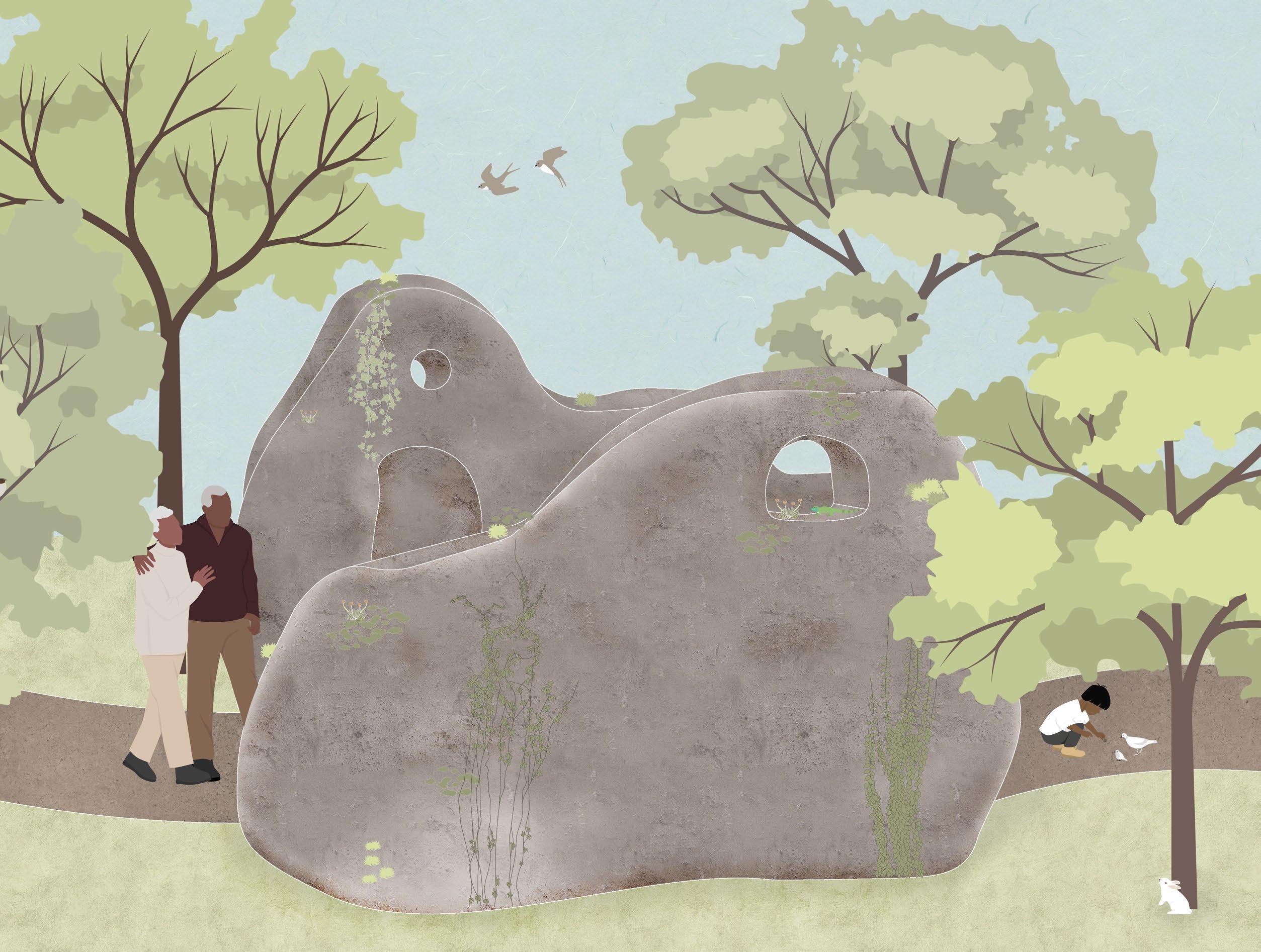 There are a few bird species in the area that burrow into soil walls which normally run along riverbanks such as: the River Sparrow, Bee-eater, and Kingfisher, however there is a lack of banks in the area. This pavilion seeks to remedy that by cutting through the berm located at the entrance to the Central Path and providing apertures in the rammed earth retaining walls for the birds to burrow into the earth behind. A viewing area is carved out of the earth on the opposite side of the opening, which not only allows for visitors to discreetly birdwatch, but to also share the experience being surrounded by earth inside a “burrow”.
