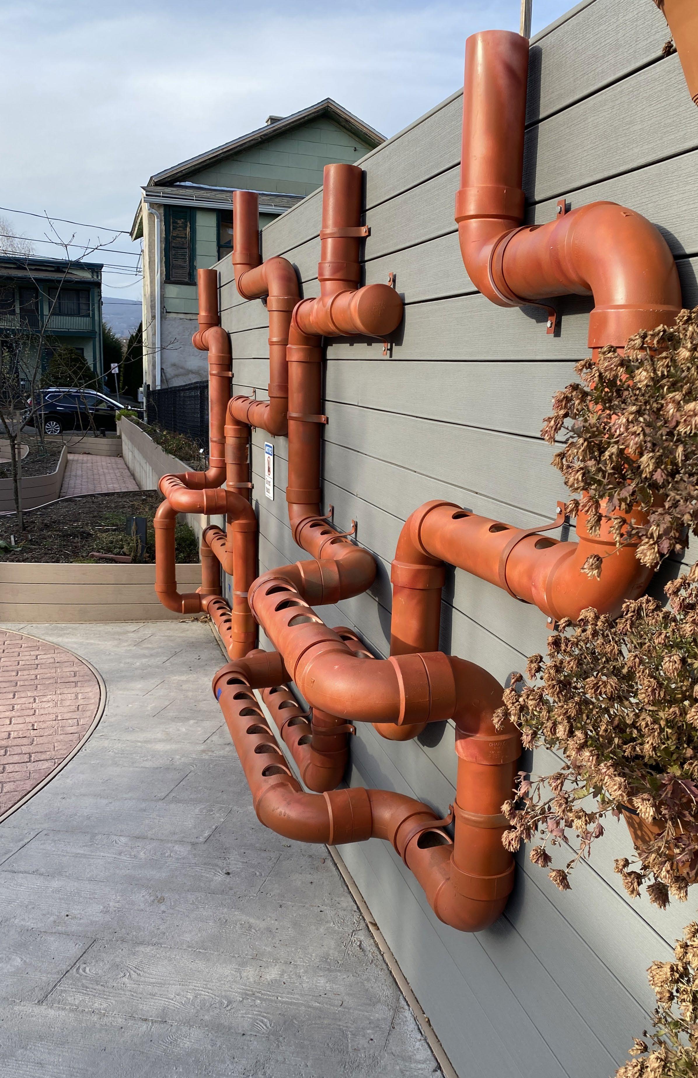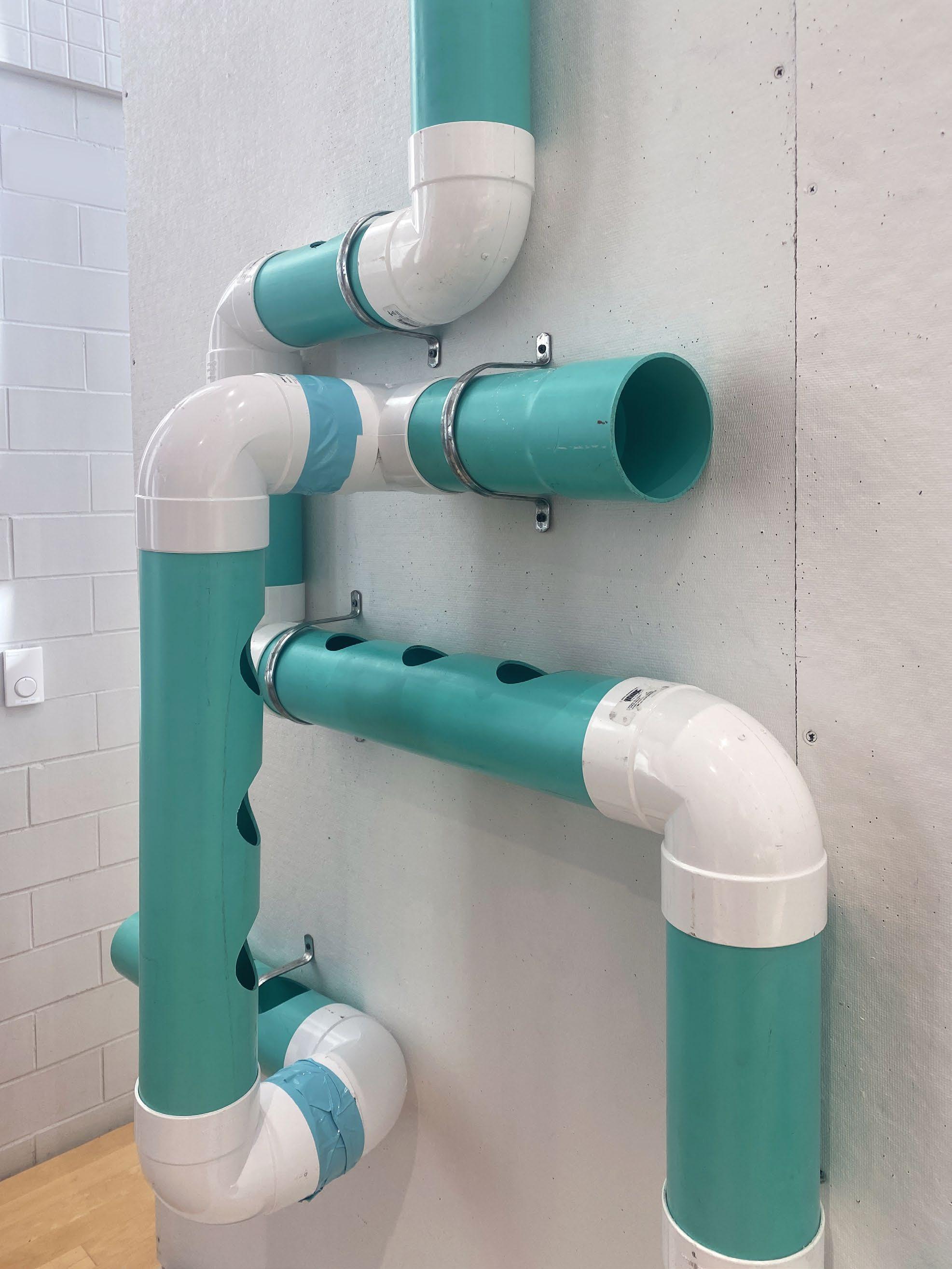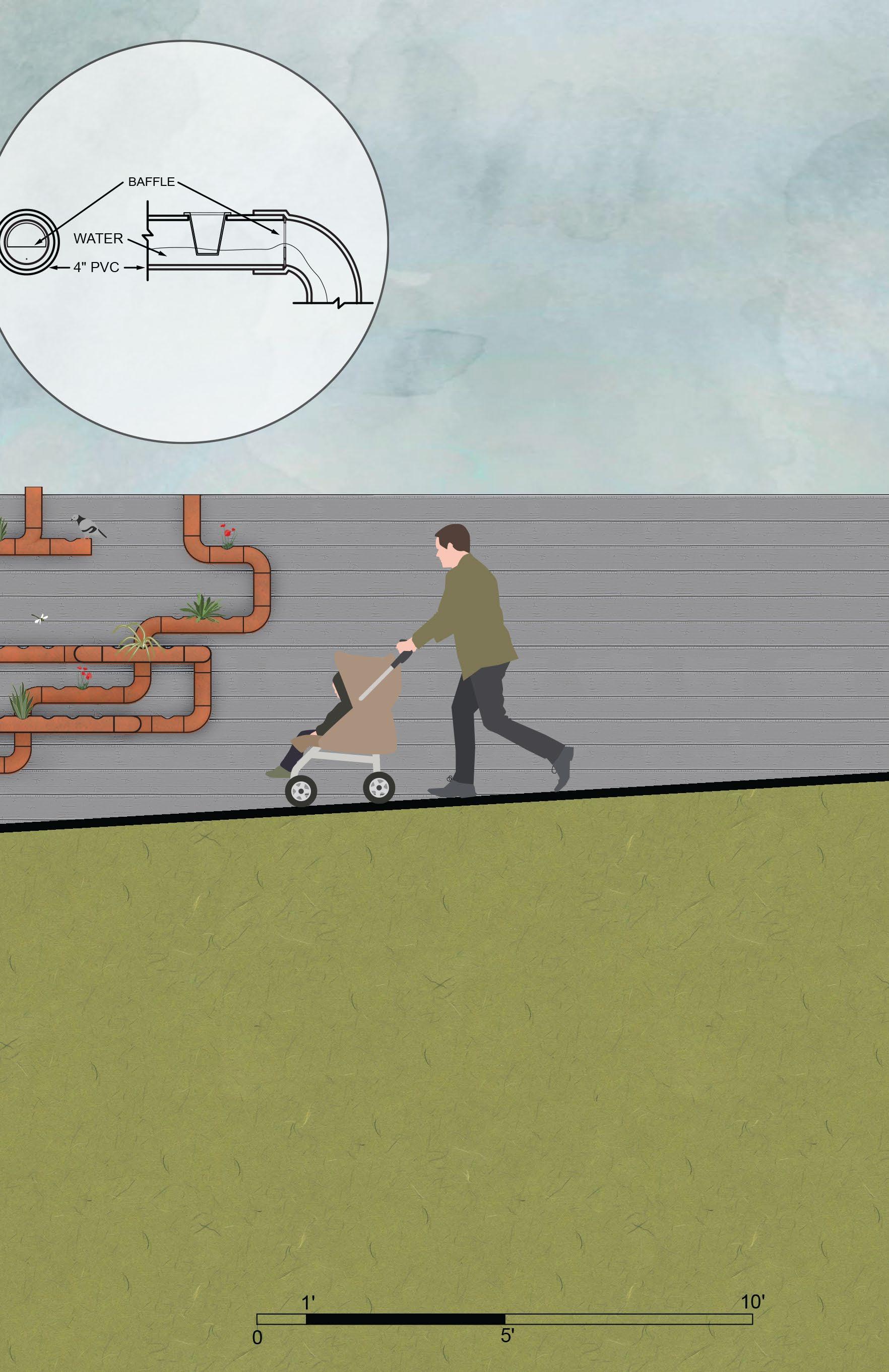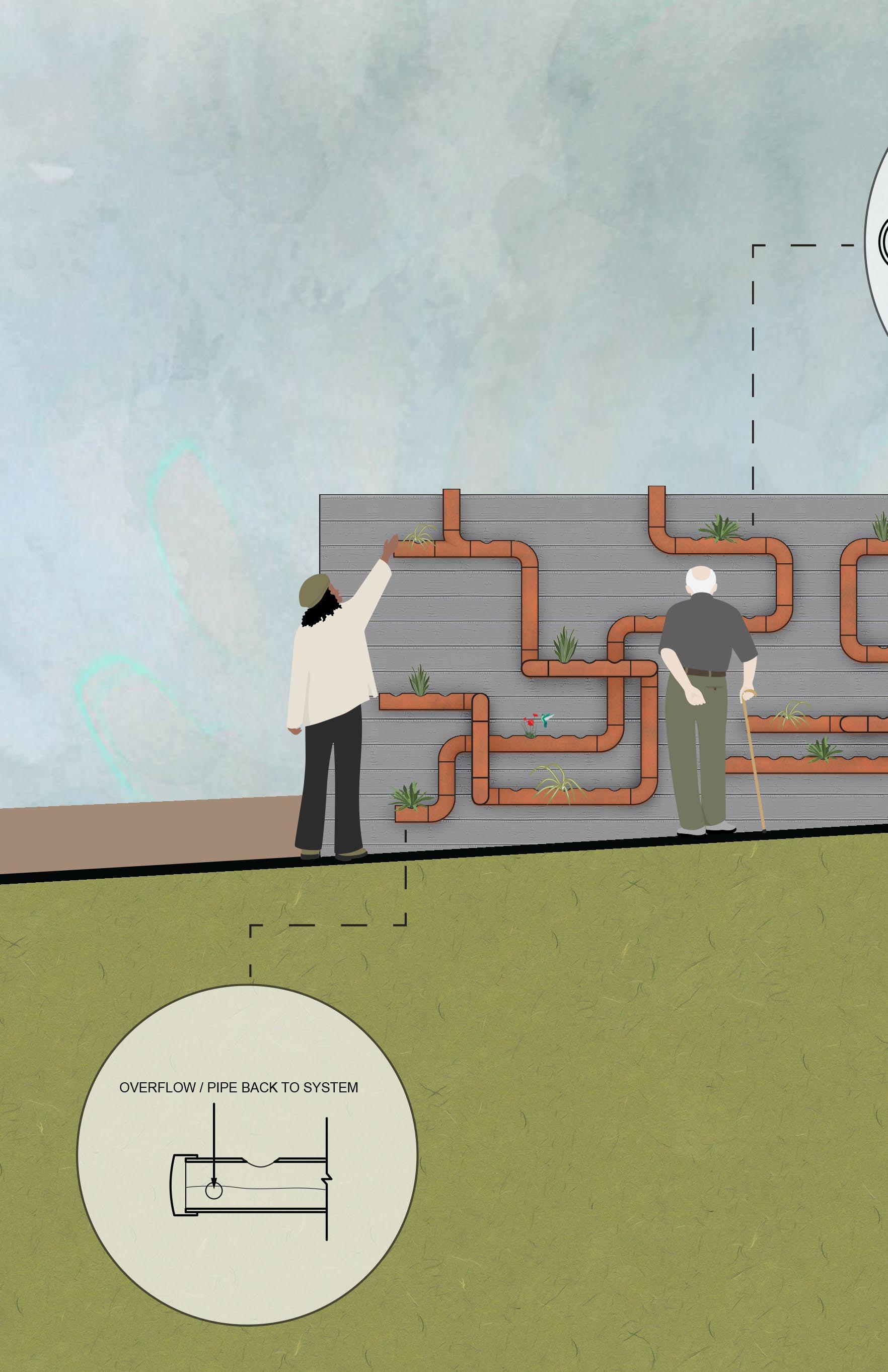 The community garden as a whole functioned so that any member of the community could learn how to grow their own produce and this planter wall provided an alternative way of gardening in an urban setting. This vertical planter pumps water through PVC pipes in a circular system to grow plants via hydroponics. The integration of constant water was important in order to provide a water source for birds, insects and other animals in the ecosystem to promote biodiversity.