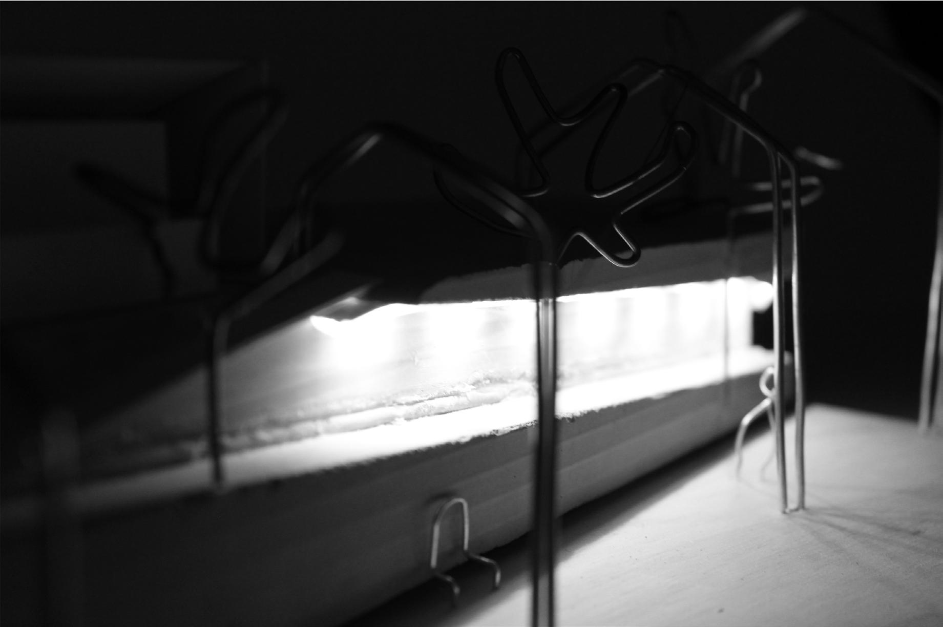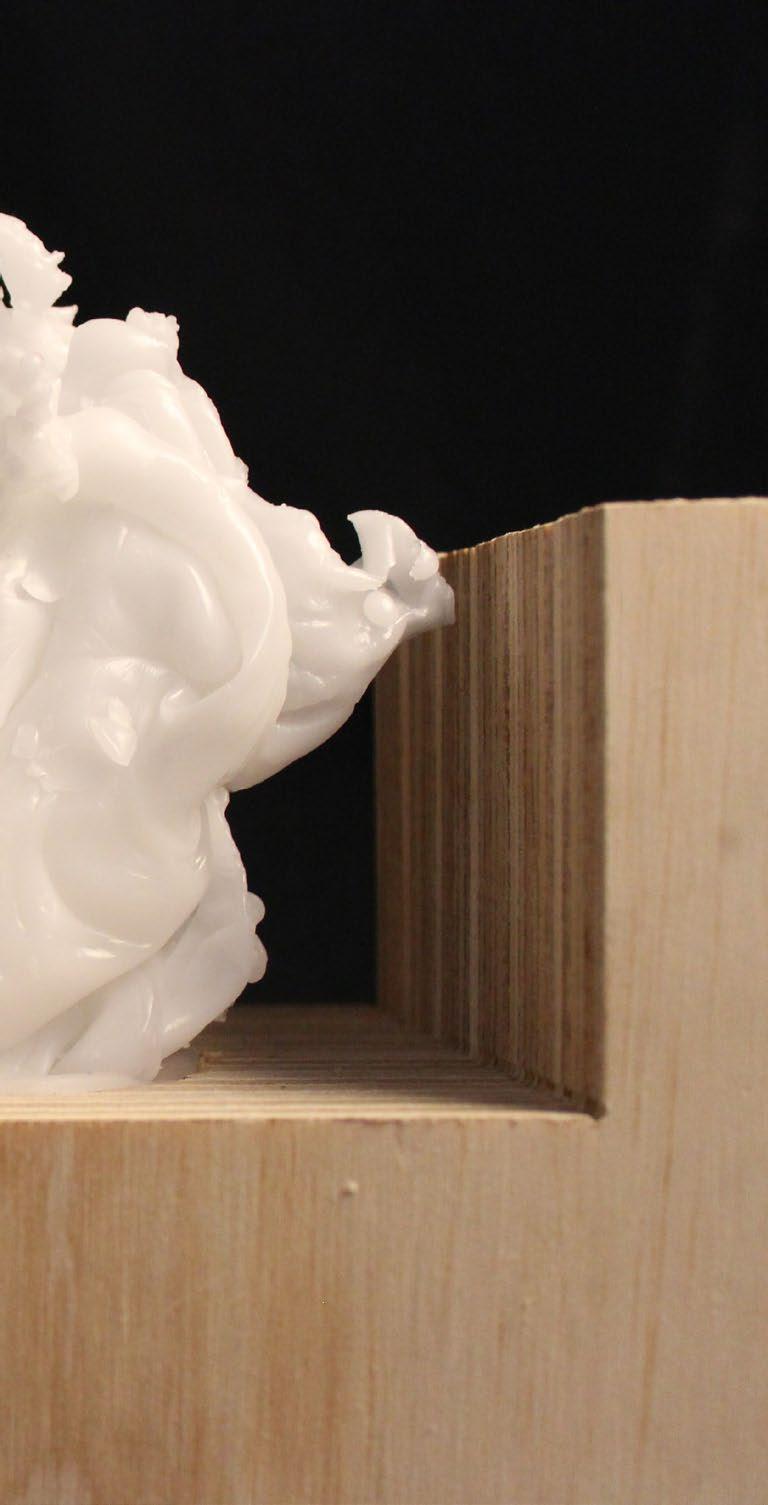 Dark Chalet was used as a precedent study for Submerge, mainly focusing on the hearth in relation to space. These drawings were hand-drafted in conjunction with colleague, Lauren Smith. The wax and wood model was an abstraction of the central hearth and was used as an exploration of the reaction of melted wax dripped into water. The result was a whimsical sculpture that echoed the reaching limbs that can be seen in Tom Wiscombe’s design.