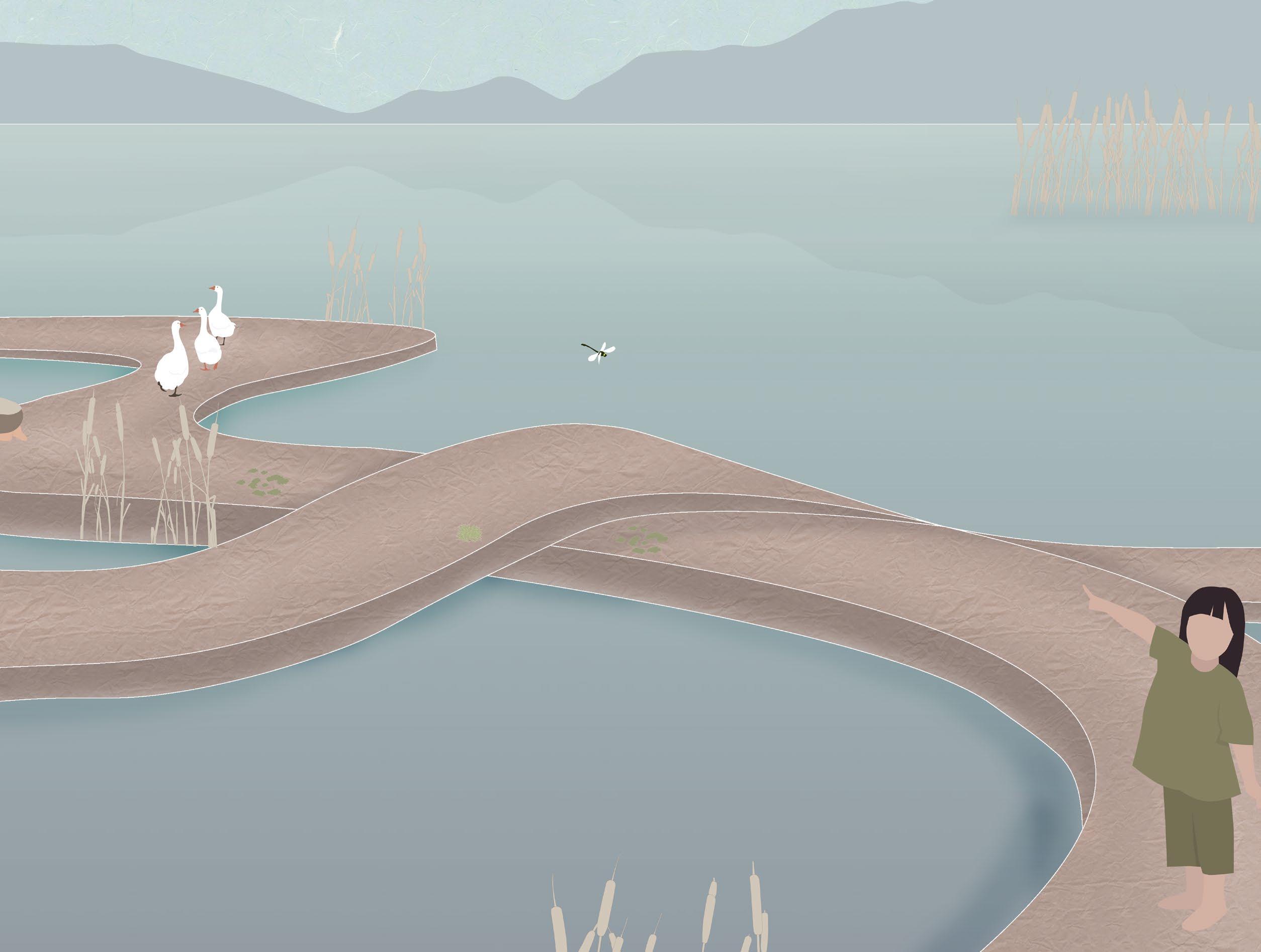The Beautiful River Emerald dragonfly and the Bronze Emerald dragonfly are two species that are on the Almost Threatened Italian red list as they require excellent water quality. This means that they are one of the many animals that are on their way to becoming endangered. Pavilion No. 2 provides an area within the marshland to begin the process of reintroducing peat moss back into the area. Peat purifies and cleanses water as it passes through and it also provides ideal conditions for dragonflies to lay their eggs. This space allows the human user to skim along the water at various heights, much like the behavior of a dragonfly.