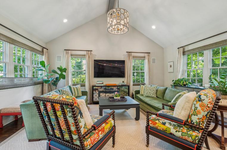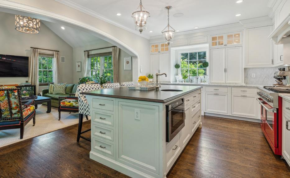 An enviable center hall floor plan and generously sized rooms set the tone. An inviting front-to-back fireside living room features two sets of French doors that open to an idyllic sun room with three walls of transomed windows that take in verdant property views. French doors open to a formal dining room enhanced with a custom designed marbletopped wet bar with burled wood and inset lighting. An undermount wine fridge creates easy entertaining. Inlaid ceiling borders add cachet to the room.