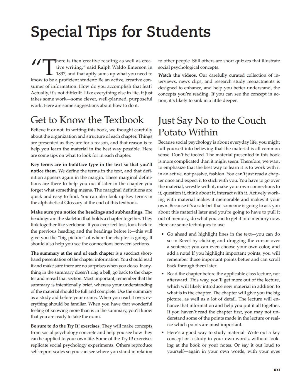 • Las t b u t no t least , remember tha t this materi al is a lo t of fun . You h aven't even s t arted reading the book ye t, b u t we thin k you' r e go ing to l ike it. In parti cular, you 'll see how much soci a l psychology has t o t ell you abou t yo u r r eal , everyday li fe. As this course p r ogresses, you m jgh t want to remin d yo u rself to ob serve the even t s o f your da il y li fe wi th new eyes - the eyes
