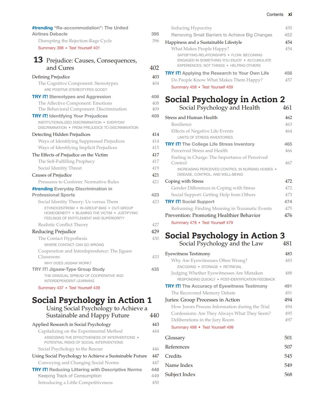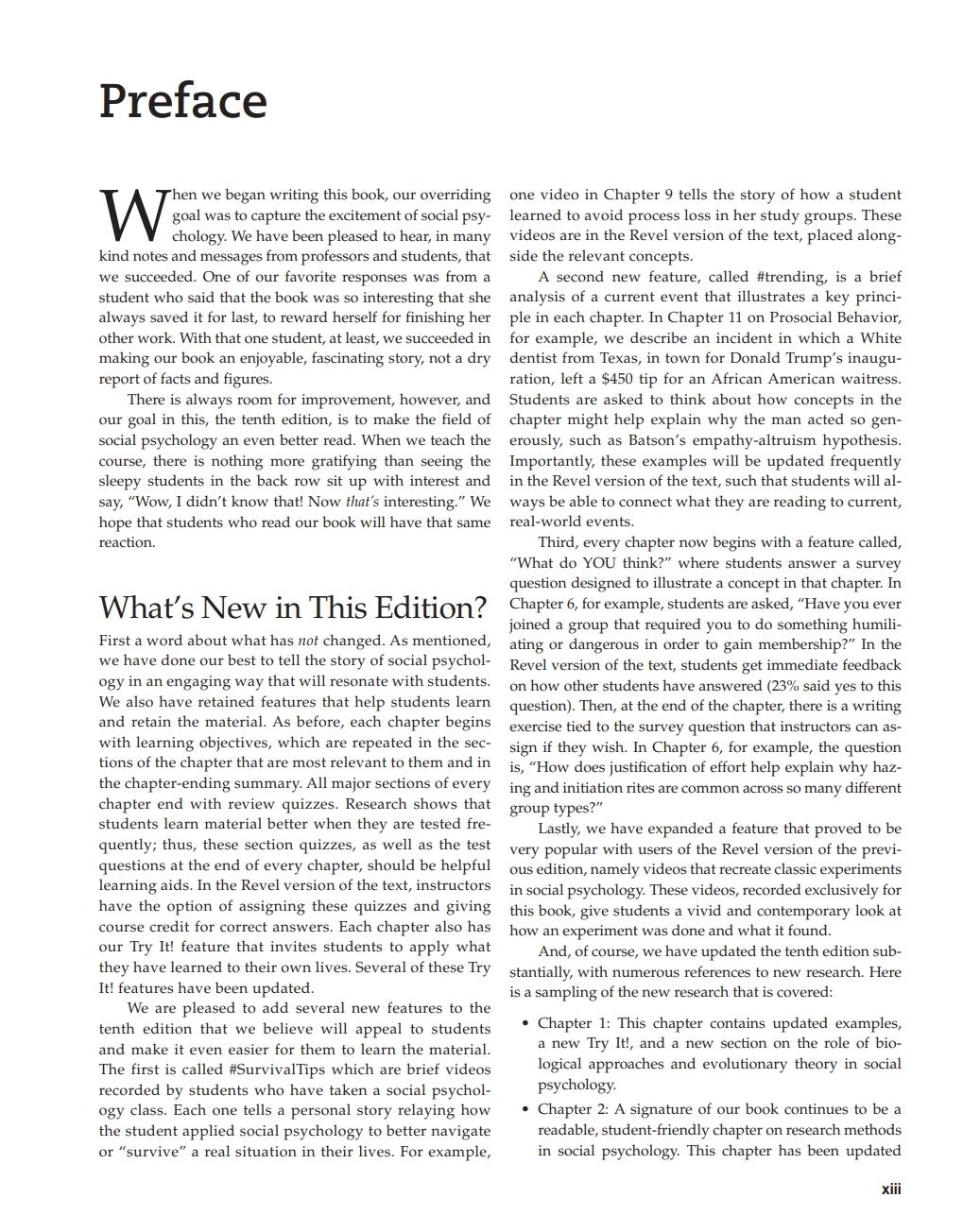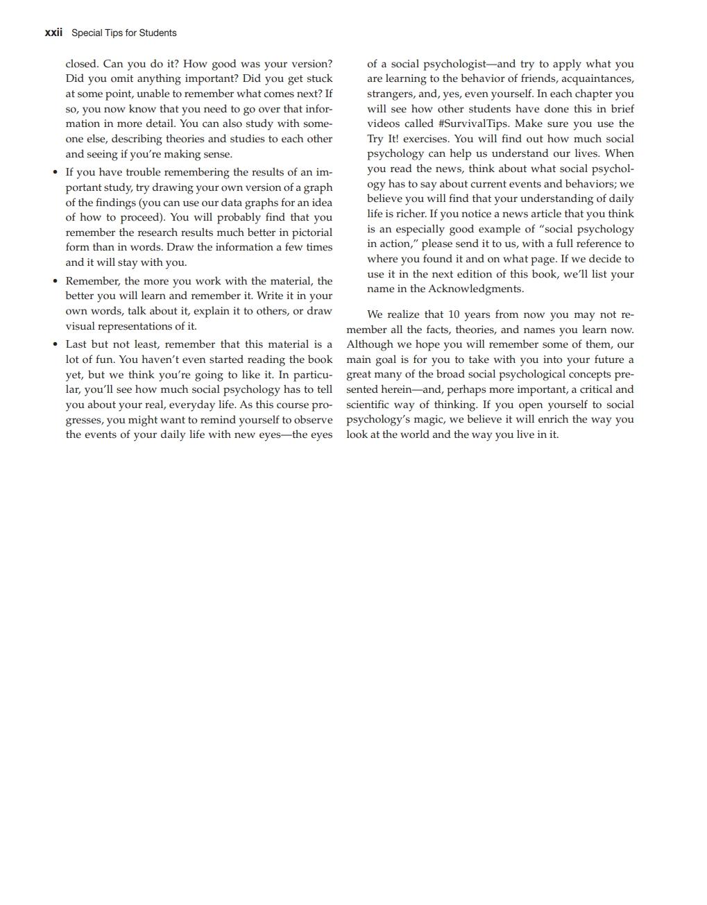 o f a social psycho logis t- and tr y t o apply wha t you a re lea r ning to the b ehavio r of fr iends, acquaintances, s tr anger s, a n d, yes, even you rself. In each chap ter you wi ll see how o th er studen ts h ave done this in br ief v ideos called #Su rv iva lTips. Ma ke sur e you use the Try It! exer cises. Yo u w ill fi n d ou t how m u ch socia l psychol ogy can h e lp u s u n de rstand o u r li ves. When you read th e news, think a b out w h a t social psycho logy has t o say a b out curren t even t s and behav iors; we believe you wi ll find tha t you r u nders t a n din g of dai ly life i s ri ch er. If yo u n otice a n ews a rtic le tha t yo u think is a n espec i ally good examp le of "socia l psychology in ac ti on," p lease sen d it t o u s, wi th a full reference t o where you fou n d i t a n d o n w h a t page. If we deci de t o u se it in the next edition o f this boo k, we'll lis t you r n ame in th e Acknow l edgments.