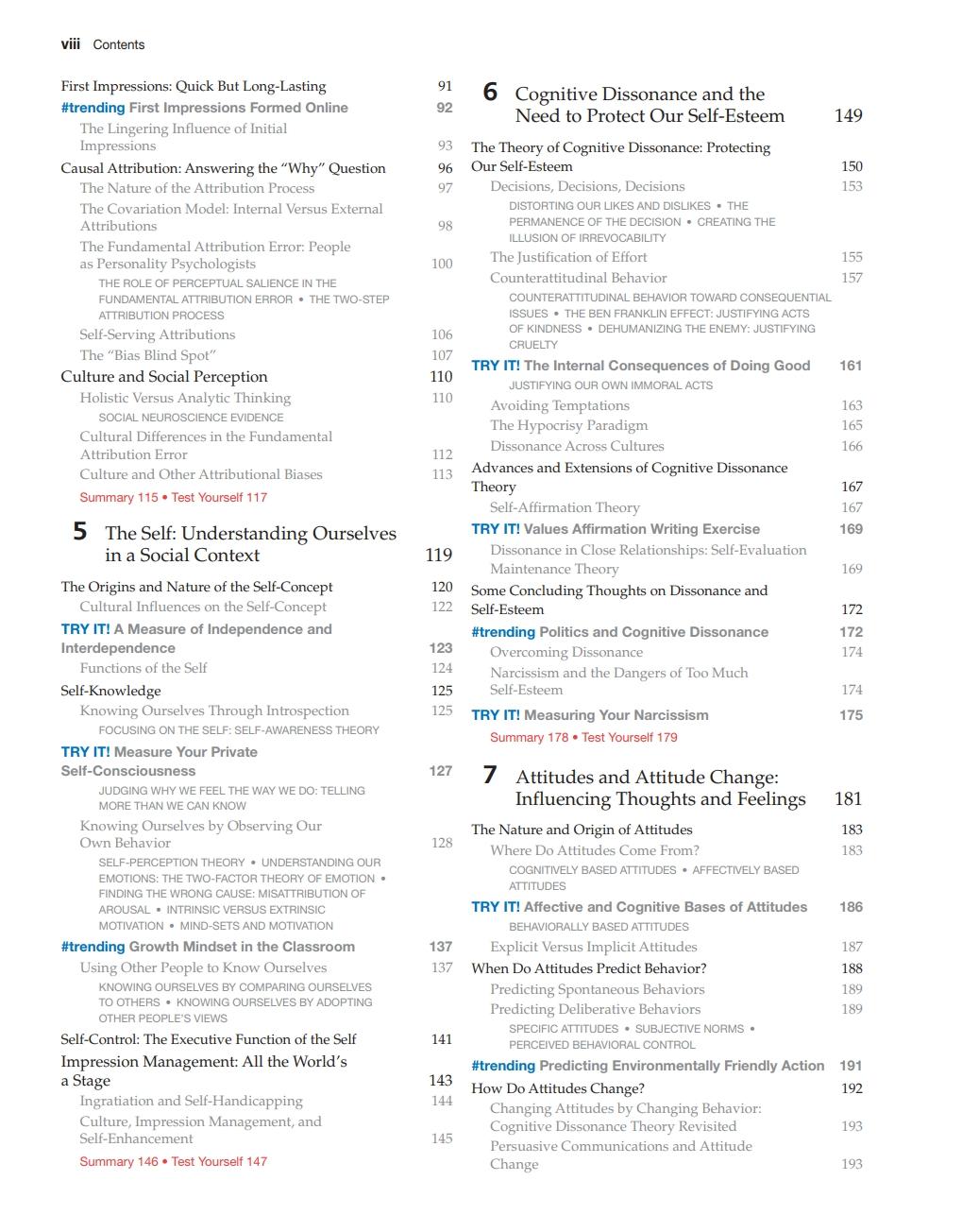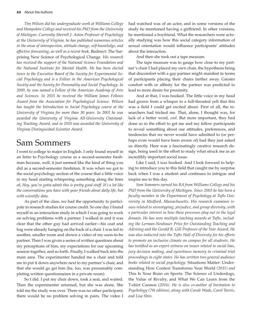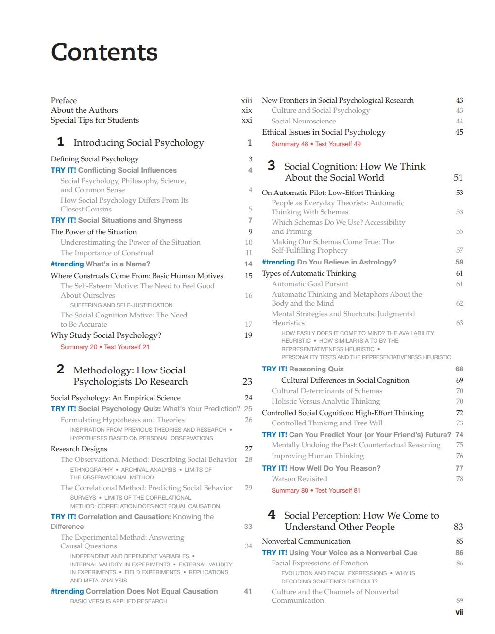 o f a social psycho logis t- and tr y t o apply wha t you a re lea r ning to the b ehavio r of fr iends, acquaintances, s tr anger s, a n d, yes, even you rself. In each chap ter you wi ll see how o th er studen ts h ave done this in br ief v ideos called #Su rv iva lTips. Ma ke sur e you use the Try It! exer cises. Yo u w ill fi n d ou t how m u ch socia l psychol ogy can h e lp u s u n de rstand o u r li ves. When you read th e news, think a b out w h a t social psycho logy has t o say a b out curren t even t s and behav iors; we believe you wi ll find tha t you r u nders t a n din g of dai ly life i s ri ch er. If yo u n otice a n ews a rtic le tha t yo u think is a n espec i ally good examp le of "socia l psychology in ac ti on," p lease sen d it t o u s, wi th a full reference t o where you fou n d i t a n d o n w h a t page. If we deci de t o u se it in the next edition o f this boo k, we'll lis t you r n ame in th e Acknow l edgments.