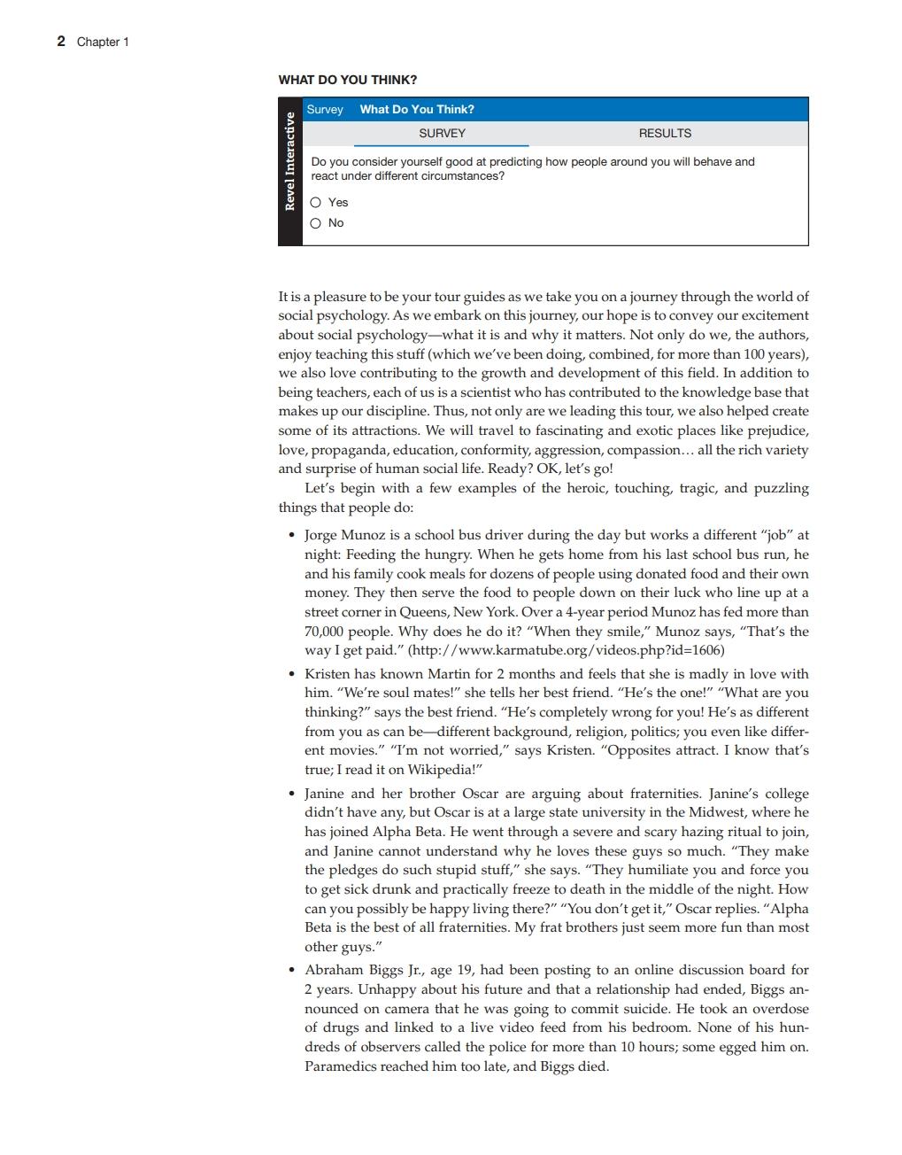 It is a p leasure to be your tour gui des as we ta ke you on a jou rney thro u g h the worl d of socia l psycho logy. As we embark on this journey, o u r h ope is to convey our exci temen t abou t soci al psychology- what it is and why i t ma tte r s. Not o n ly do we, th e au tho r s, enjoy t eachin g this stu ff (which we've been doing, combin ed, fo r more th an 100 years), we a lso love contribu t ing to the grow th and deve lopmen t of this fie l d. In add iti on to b e ing t eachers, each of u s is a scie n tist who h as con trib u ted to the know ledge base that ma kes u p our discipli n e. Thus, n o t only a r e we leading this t our, we also helped crea te some of i ts attr action s. We w ill travel t o fascinating and exo ti c places like prejudice, love, p r opaganda, ed u cati on, con fo rmity, aggr ess ion, compassion all the ri ch var iet y and s u rp rise o f h uman social life. Ready? OK, let's go! Let's begin w i th a f ew examp les of the he ro ic, to u ching, tragic, and p u zzling things th a t people do: