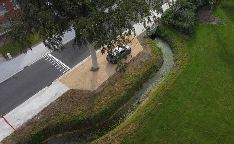 droger zal worden. Als het regent, zal het sneller leiden tot overstromingen en ondergelopen straten. Om beide fenomenen tegen te gaan, moeten we regenwater niet zomaar afvoeren naar de riolen maar maximaal bijhouden op de plaats waar het valt. De bermen werden volledig als groenberm aangelegd. Waar bij publieke