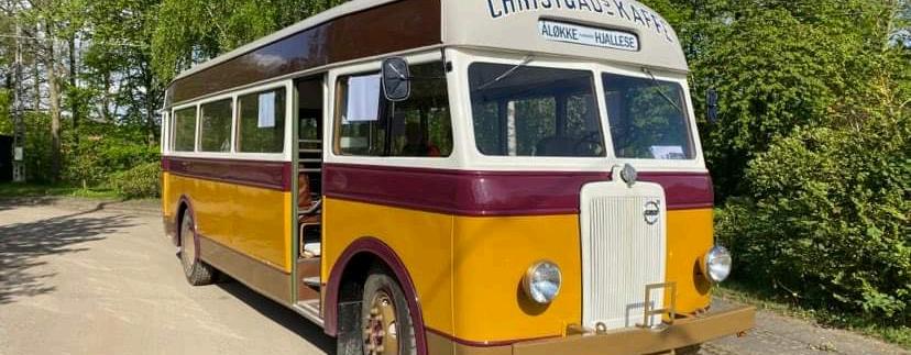 gangirestaureringen Bussenernuisinoprindelige standfra1949,dogmedmodernetilføjelsersom ekstrabaglygterogblinklysforatopfyldenutidens kravvedsynafbussen.