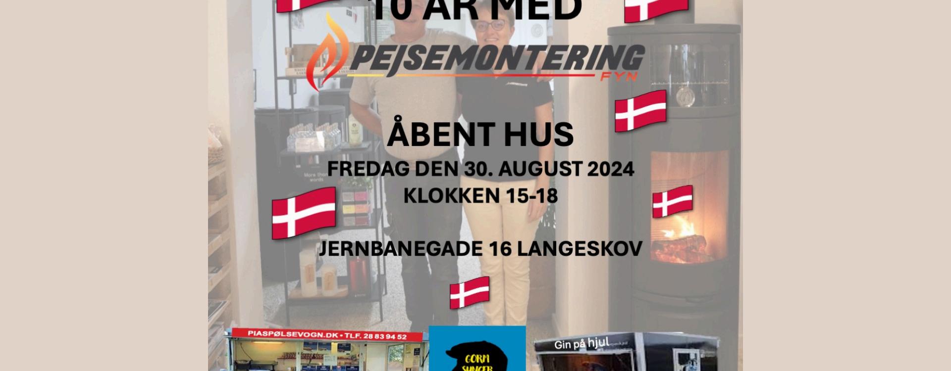 Iforbindelsemedsit10-årsjubilæuminvitererJørgenfra PejsemonteringFynkunder,forretningsforbindelser,familieogvenner tiljubilæumogåbenthus,hvordervilværeunderholdningoglidtgodt tilganen