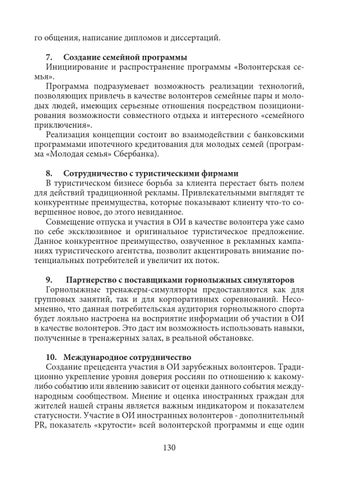 го общения, написание дипломов и диссертаций. 7. Создание семейной программы Инициирование и распространение программы «Волонтерская семья». Программа подразумевает возможность реализации технологий, позволяющих привлечь в качестве волонтеров семейные пары и молодых людей, имеющих серьезные отношения посредством позиционирования возможности совместного отдыха и интересного «семейного приключения». Реализация концепции состоит во взаимодействии с банковскими программами ипотечного кредитования для молодых семей (программа «Молодая семья» Сбербанка). 8. Сотрудничество с туристическими фирмами В туристическом бизнесе борьба за клиента перестает быть полем для действий традиционной рекламы. Привлекательными выглядят те конкурентные преимущества, которые показывают клиенту что-то совершенное новое, до этого невиданное. Совмещение отпуска и участия в ОИ в качестве волонтера уже само по себе эксклюзивное и оригинальное туристическое предложение. Данное конкурентное преимущество, озвученное в рекламных кампаниях туристического агентства, позволит акцентировать внимание потенциальных потребителей и увеличит их поток. 9. Партнерство с поставщиками горнолыжных симуляторов Горнолыжные тренажеры-симуляторы предоставляются как для групповых занятий, так и для корпоративных соревнований. Несомненно, что данная потребительская аудитория горнолыжного спорта будет лояльно настроена на восприятие информации об участии в ОИ в качестве волонтеров. Это даст им возможность использовать навыки, полученные в тренажерных залах, в реальной обстановке. 10. Международное сотрудничество Создание прецедента участия в ОИ зарубежных волонтеров. Традиционно укрепление уровня доверия россиян по отношению к какомулибо событию или явлению зависит от оценки данного события международным сообществом. Мнение и оценка иностранных граждан для жителей нашей страны является важным индикатором и показателем статусности. Участие в ОИ иностранных волонтеров - дополнительный PR, показатель «крутости» всей волонтерской программы и еще один 130