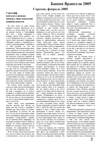 Башня Врангеля 2005 Саратов, февраль 2005 Саратофф, или как я дважды обманул лицо кавказкой национальности. Не знаю зачем, не знаю почему (наверно хотелось пробздется, да и заебала эта ебучая зима), но мы всё же решили поехать в Саратофффф, для этого с моим товарищем и лепшим другом было пробито, что в этом прекрасном месте, в таких то числах будет проходить конференция “Молодых ученых и специалистов в области юриспруденции”, (извиняюсь за свой русский, но так она называлась). Мы решили попробовать туда, отправится, а что бы ещё на это и брюль минимальный ушёл, мы решили подключить сюда и универ, который, как оказалось и рад нас отправить на такое нужное всем мероприятие, да ещё и готов всё это безобразие оплатить. И когда дело было в шляпе и деньги были получены, мы пошли за билетами. И тут началось. Вдруг выяснилось, что друг взял не тот паспорт, и мне пришлось ждать его на вокзале, добрых 0.5 часа или, литра, не помню (две недели или три прошло), короче рядом со мной никого не было, а очевидцев найти не удалось, поэтому, что я делал, пока ждал Б-ка сказать однозначно не могу. Скажу многозначно - неважно. Но билеты были куплены, как, оказалось, нашел на утро под подушкой, как они там оказались, не помню. По ним я вспомнил, что я, куда-то собираюсь, а, найдя в билете знакомые буквы, смог, наконец-таки понять куда. Эх, как же меня это тогда обрадовало, что после алкогольный синдром ушёл, как-то сам собой. Опять забыл, тетка продавщица тикетов, продала нам билеты, не рядом как мы хотели, а верхний и нижний ряд (или полки, не помню, как правильно). И сказала, что для того, что бы места были внизу, нужно быть, как минимум, инвалидом, и тогда предъявив соответственно справку, что ты инвалид (ВОВ, например), ты получишь желанные билеты. Наши же доводы, по поводу инвалидности её видимо не устроили. Хотя я пытался показать, что прихрамываю на обе ноги. Не вышло. Дурдом, короче. И вот он день, когда поезд (желтый был поезд) должен был понести нас в неизвестность, хотя нет, мы знали