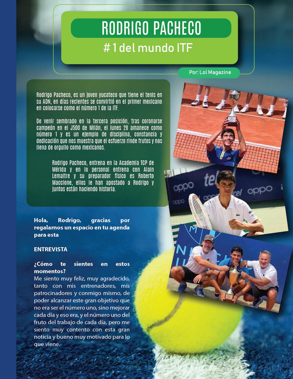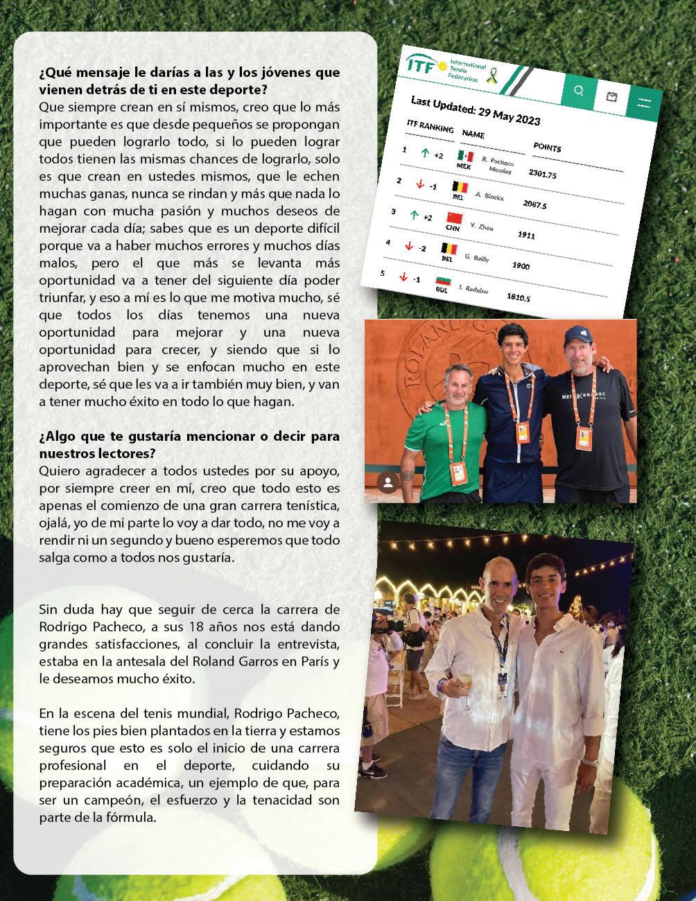 Nuestra portada y páginas centrales, las dedicamos a Rodrigo Pacheco, con una entrevista en exclusiva que nos dio desde París, Rodrigo Pacheco se coloca en la posición número 1 del tenis, haciendo historia como el primer mexicano en llegar a la cima del ranking de la ITF.