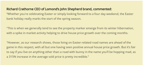 ThelatestresearchbyLomond,oneoftheUK’slargest estateandlettingagencygroups,hasrevealedthatone Easter-relatedroadnamehasseena315%annualincrease intheaveragesoldprice.