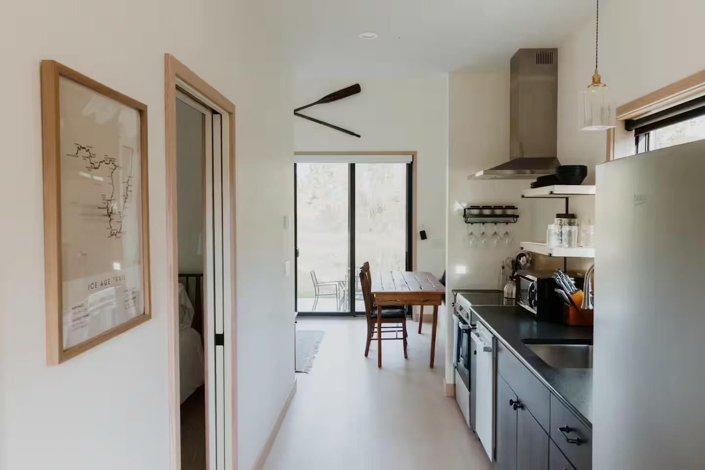 Need a cozy getaway? Experience the Bird House, a Scandinavian-inspired tranquil, private woodland paradise. Melt away stress in the hot tub or infrared sauna as you enjoy views of the meadow. Explore snowshoe and cross-country ski trails nearby in the scenic Kettle Moraine. Stream your favorite movie on the projector near the cozy fireplace or unwind at SoLu winery, just a minute down the road. Near Road America, Kettle Moraine State Forest, and Dundee. Your cozy getaway awaits!