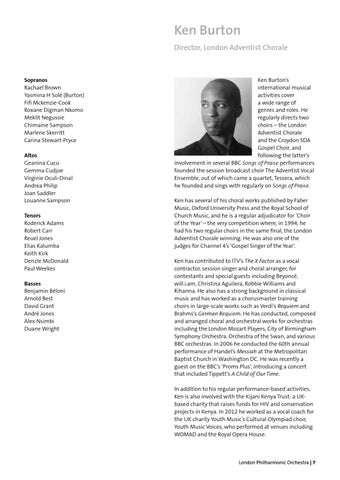 Ken Burton’s international musical activities cover a wide range of genres and roles. He regularly directs two choirs – the London Adventist Chorale and the Croydon SDA Gospel Choir, and following the latter’s involvement in several BBC Songs of Praise performances founded the session broadcast choir The Adventist Vocal Ensemble, out of which came a quartet, Tessera, which he founded and sings with regularly on Songs of Praise. Ken has several of his choral works published by Faber Music, Oxford University Press and the Royal School of Church Music, and he is a regular adjudicator for ‘Choir of the Year’ – the very competition where, in 1994, he had his two regular choirs in the same final, the London Adventist Chorale winning. He was also one of the judges for Channel 4’s ‘Gospel Singer of the Year’. Ken has contributed to ITV’s The X Factor as a vocal contractor, session singer and choral arranger, for contestants and special guests including Beyoncé, will.i.am, Christina Aguilera, Robbie Williams and Rihanna. He also has a strong background in classical music and has worked as a chorusmaster training choirs in large-scale works such as Verdi’s Requiem and Brahms’s German Requiem. He has conducted, composed and arranged choral and orchestral works for orchestras including the London Mozart Players, City of Birmingham Symphony Orchestra, Orchestra of the Swan, and various BBC orchestras. In 2006 he conducted the 60th annual performance of Handel’s Messiah at the Metropolitan Baptist Church in Washington DC. He was recently a guest on the BBC’s ‘Proms Plus’, introducing a concert that included Tippett’s A Child of Our Time. In addition to his regular performance-based activities, Ken is also involved with the Kijani Kenya Trust: a UKbased charity that raises funds for HIV and conservation projects in Kenya. In 2012 he worked as a vocal coach for the UK charity Youth Music’s Cultural Olympiad choir, Youth Music Voices, who performed at venues including WOMAD and the Royal Opera House.