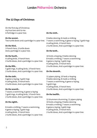 10 lords a-leaping, 9 ladies dancing 8 maids a-milking, 7 swans a-swimming 6 geese a-laying, 5 gold rings 4 calling birds, 3 French hens 2 turtle doves, And a partridge in a pear tree. On the eleventh.. 11 pipers piping, 10 lords a-leaping 9 ladies dancing, 8 maids a-milking 7 swans a-swimming, 6 geese a-laying, 5 gold rings 4 calling birds, 3 French hens 2 turtle doves, And a partridge in a pear tree. On the twelfth.. 12 drummers drumming, 11 pipers piping 10 lords a-leaping, 9 ladies dancing 8 maids a-milking, 7 swans a-swimming 6 geese a-laying, 5 gold rings 4 calling birds, 3 French hens 2 turtle doves, And a partridge in a pear tree.