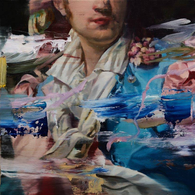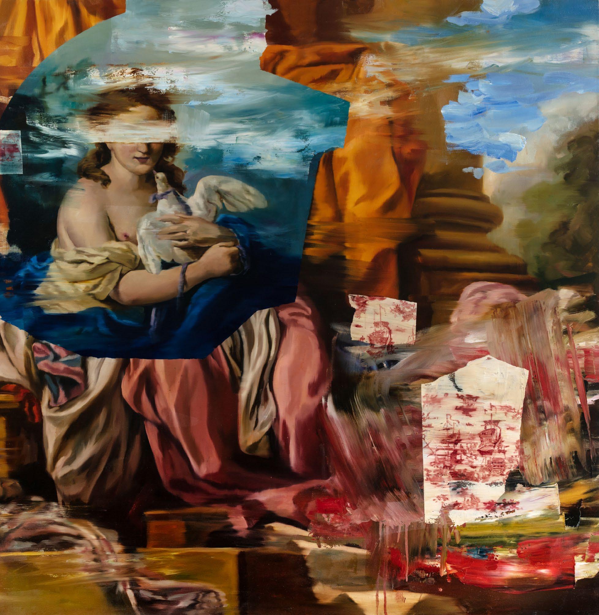 The glaze is sometimes shielded and other times positively glares with impunity at the interloper viewer. Perhaps the players are crossing the phantasmal threshold from a 17th century faux farmyard or a Dickensian tome to parade across the canvas. Liminal doorways step between intense emblematic figuration and pure abstraction, causing a frisson across the piece. Swaths of luminous paint, lay upon flesh, pawing at dainty ribbons, revelling in the dance.