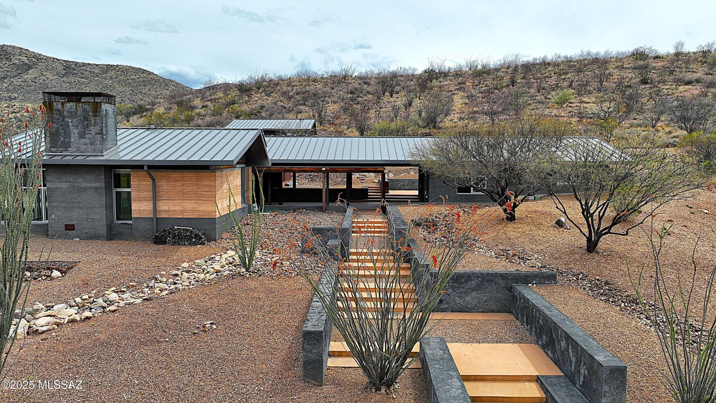 Welcome to this one of a kind compound on over 47 acres w/spectacular views. Built to last with rammed earth & lava-crete construction designed for thermal mass w/commercial windows & doors, this home features beamed ceilings, metal roofs, underground wine cella. Spacious living area w/walls of windows framing the views, striking FP, modern kitchen w/lg island, breakfast bar & sizable dining area. Concrete flrs thruout. Primary Suite w/more views & ensuite bath. Gst Qtrs connects by a lg covered breezeway & features 2BR & full bath. Terrific outdoor sauna. Detached studio w/half bath ideal for ofc/ gym. Located in the gated X9 Ranch commty, it’s the perfect place to get away from it all.