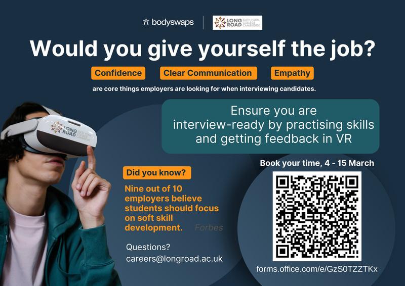 Our careers team have organised an event so that you can attend a virtual reality job interview simulation. They run 30-minute sessions, and you will be able to get feedback on your technique, ways in which you can improve, and learn how to give the best interview possible Click the photo for more information.