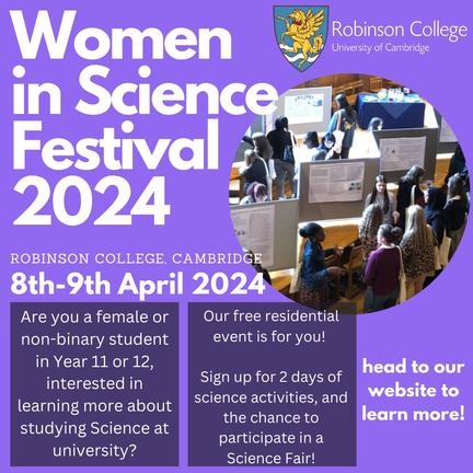 The Women in Science Festival is an annual event run by Robinson College Cambridge, designed to inspire and encourage young women and non-binary students in to pursue scientific study at university.