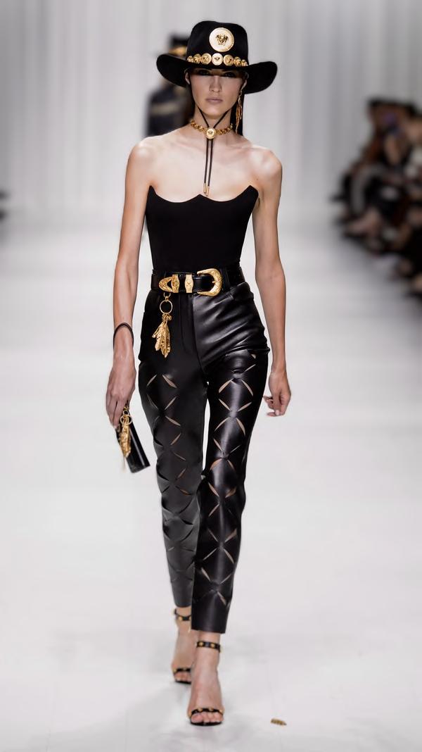 Versace's lines define and sensually accentuate suits, dresses, coats, and more, becoming a signature element of expressive fashion for the female body.