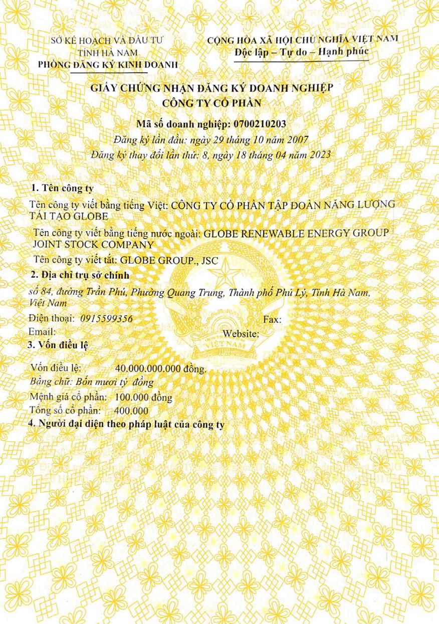 18/04/2023 với tên là Công Ty Cổ Phần Tập Đoàn Năng Lượng Tái Tạo Globe.