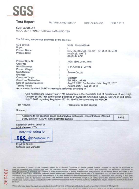 Sản phẩm móc treo của Suntex đáp ứng tiêu chuẩn quốc tế SGS, đạt chỉ tiêu chất lượng về khả năng chịu lực, độ bền, công suất treo tải, các chỉ tiêu về hoá lí, an toàn cho sức khoẻ của người tiêu dùng.