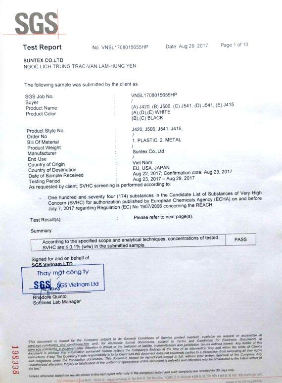 ản phẩm móc treo của Suntex được kiểm định bởi SGS Việt Nam thuộc tập đoàn SGS - tổ chức hàng đầu thế giới trong lĩnh vực Giám định, thử nghiệm, thẩm tra.