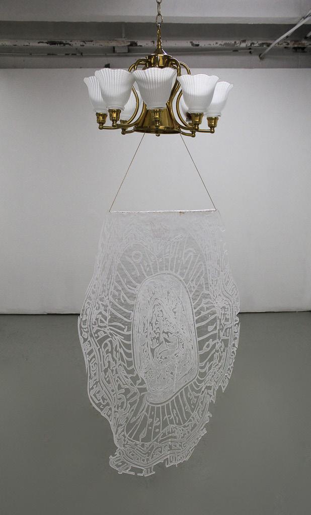 Laser etched plexiglass, chandelier, Mu’assel, brass chain, glass shades, image transfer