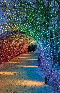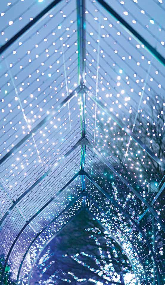 Our magnificent 24-foot-tall East Conservatory Tree is an absolute showstopper. Adorned with largerthan-life ruby gems and an ornament garland of red and gold, the tree slowly rotates, revealing its dazzling details from every angle. The tree is surrounded by ferns and poinsettias and further complemented by decadently decorated trees in the neighboring Patio of Oranges parterres. To Davis, it’s a place for “magical family memories” amid the large scale of the tree and its movement—and it’s a collaborative achievement. “Working together as a team to create something that so many will enjoy is my favorite part.”