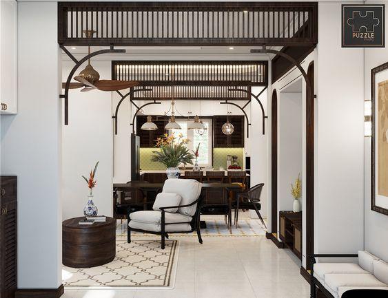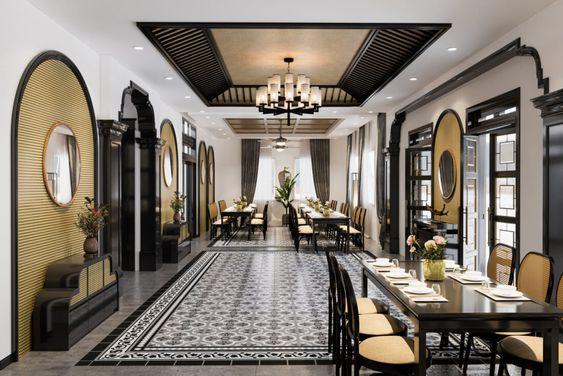 kiến trúc Pháp và văn hóa truyền thống Đông Dương, tạo nên không gian nội thất độc đáo, sang trọng và ấm cúng. Sử dụng những chi tiết và chất liệu tự nhiên, kết hợp với màu sắc ấm