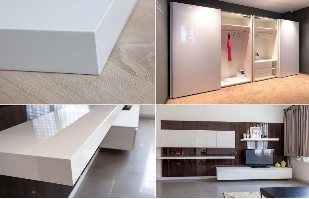Để cho thiết kế nội thất được đồng bộ, nhà cung cấp đã cho ra thêm các sản phẩm Melamin đồng màu với Laminte. (Melamin dùng làm thùng, laminate dùng làm cửa...)