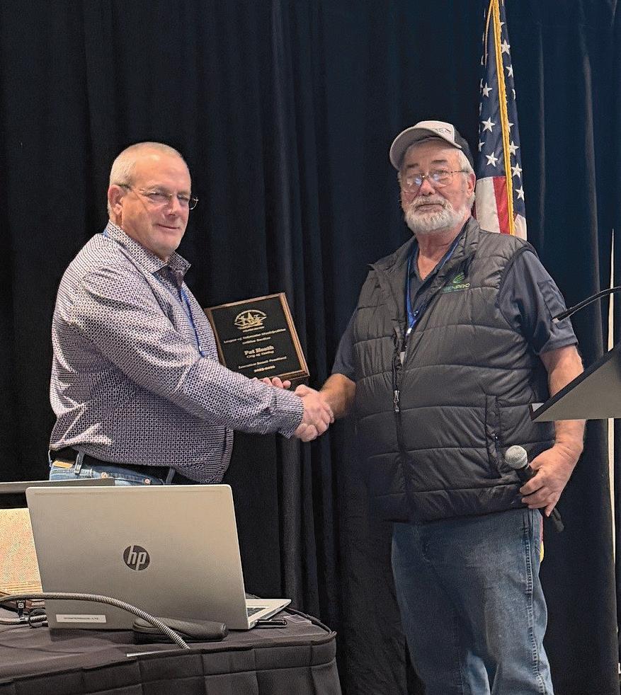 Utilities Section Executive Board President Gary Thurlow of Atkinson presented 2025-2026 Utilities Section President Pat Heath of Gering with a plaque in honor of his service.