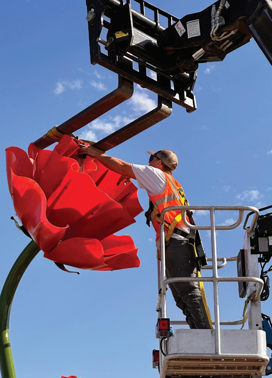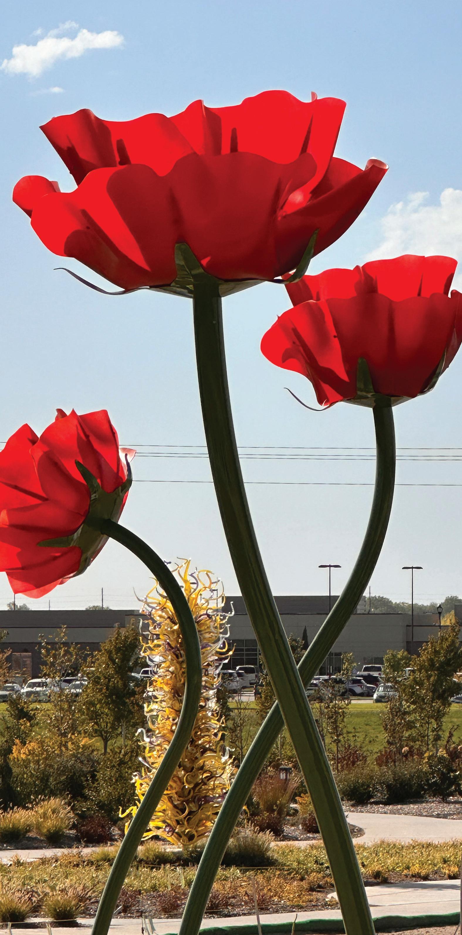 In October 2023, several 14-foot poppies were installed in Yanney Park in Kearney. The flowers, created by Placzek Studios, are constructed of hand-painted metal and poly-carbonate with LED lighting. Photo provided courtesy of the Yanney Heritage Park Foundation.
