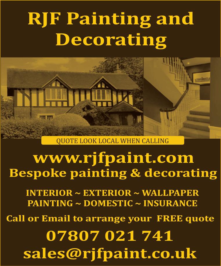 Landscape Gardening NO JOB TOO LARGE OR TOO SMALL FULLYINSURED Special Rates for O.A.P’s • TREE FELLING • TOPPING • SHAPING • REMOVALOFALLDEAD WOOD • HEDGE TRIMMING • ROOTS TREATED • REMOVALOFALLDANGEROUS LIMBS • GENERALPRUNING • ALLDEBRIS REMOVED • FRUIT TREES SPRAYED PRUNED • CONIFERS TOPPEDAND SHAPED • FENCING • TURFING UNDERTAKEN • OTHER GARDENING SERVICES Tel:01283711243Mob:07872939745 Contact: D. Hall FOR FREE ESTIMATES & EXPERTADVICE (Given without obligation) PH Construction We specialise in all aspects of building, landscapes, maintenance & heating • Gutter emptying / repair • Tree felling • Stump removal • Heating • Patios • Driveways • Extensions • Conservatories • Fencing • Loft Boarding Call Peter on 07456 482078 For more information visit our website: pehconstruction.co.uk