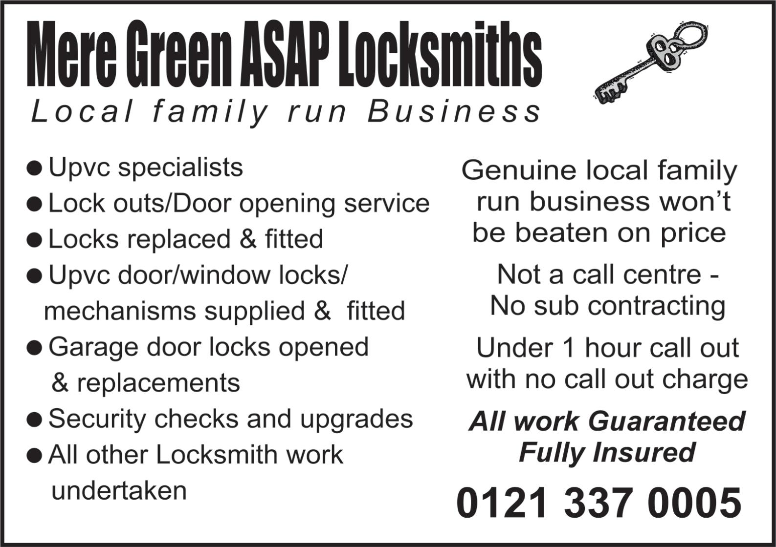 TO ADVERTISE YOUR BUSINESS CALL 01922 687430 OR VISIT WWW.LOOKLOCAL.COM Local family run Business Mere Green ASAP Locksmiths