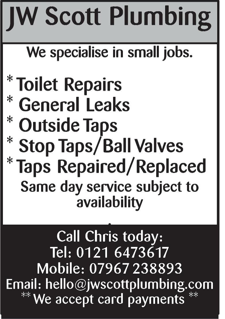 PLEASE MENTION LOOK LOCAL WHEN RESPONDING TO ANY OF OUR ADVERTS fairvalueplumbing@gmail.com www.fairvalueplumbing.com Covering Sutton Coldfield & surrounding areas KITCHEN MAKEOVERS ANY CABINET DOOR, ANY SIZE, MADE TO MEASURE Transform your kitchen into a swish new one by replacing your doors, fronts, drawers, pelmets, plinths, cornices, end panels, hinges & handles. We supply and fit a huge range of doors including: • Gloss doors • Painted doors • Handleless • Slab or Shaker • Made in the UK + 6 year guarantee FREE FITTING THIS MONTH Call for a free quotation 0121 827 5514 sales@kfmakeovers.co.uk www.kfmakeovers.co.uk Before you rip out your old kitchen... STOP