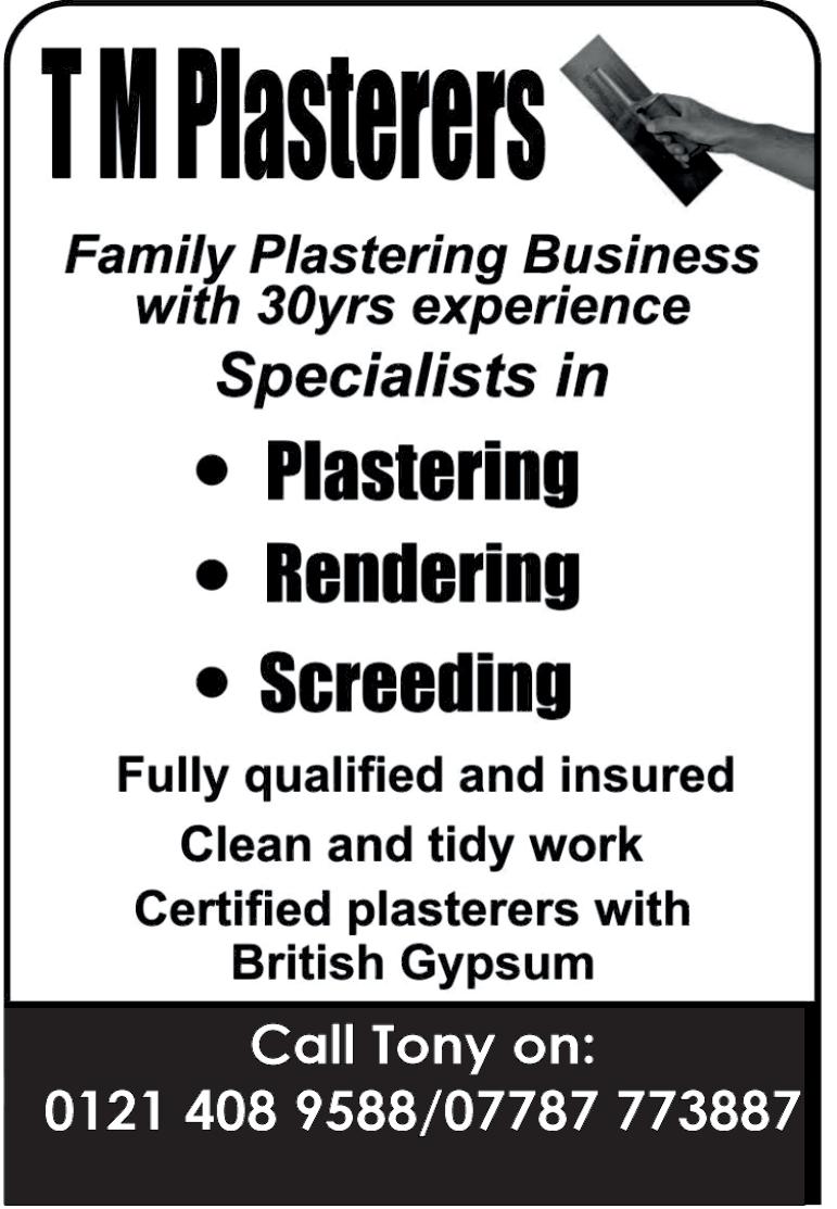 TO ADVERTISE YOUR BUSINESS CALL 01922 687430 OR VISIT WWW.LOOKLOCAL.COM All Roofing & Roof Repairs • uPVC Soffits • Fascias • Tiles Guttering • Plumbing • Bathrooms & Tiling • Kitchens Supply & Fit Plastering • Extensions • All Electrical & Insurance Work Undertaken • FREE CALLOUTS & ESTIMATES • FULLY INSURED reliable, friendly service with attention to detail O10% AP DISCOUNT Locally based first rate decorator and handyman with 15+ years experience offering the following services: Carpentry Minor electrical work Shelving Refelting summer houses & sheds Hanging pictures, mirrors & fixing curtain rails Fencing repairs Grass cutting General handyman work Paul James For a no obligation free quote why not give me a ring on: 0121 240 0022/07802 697660 My rates are very competitive