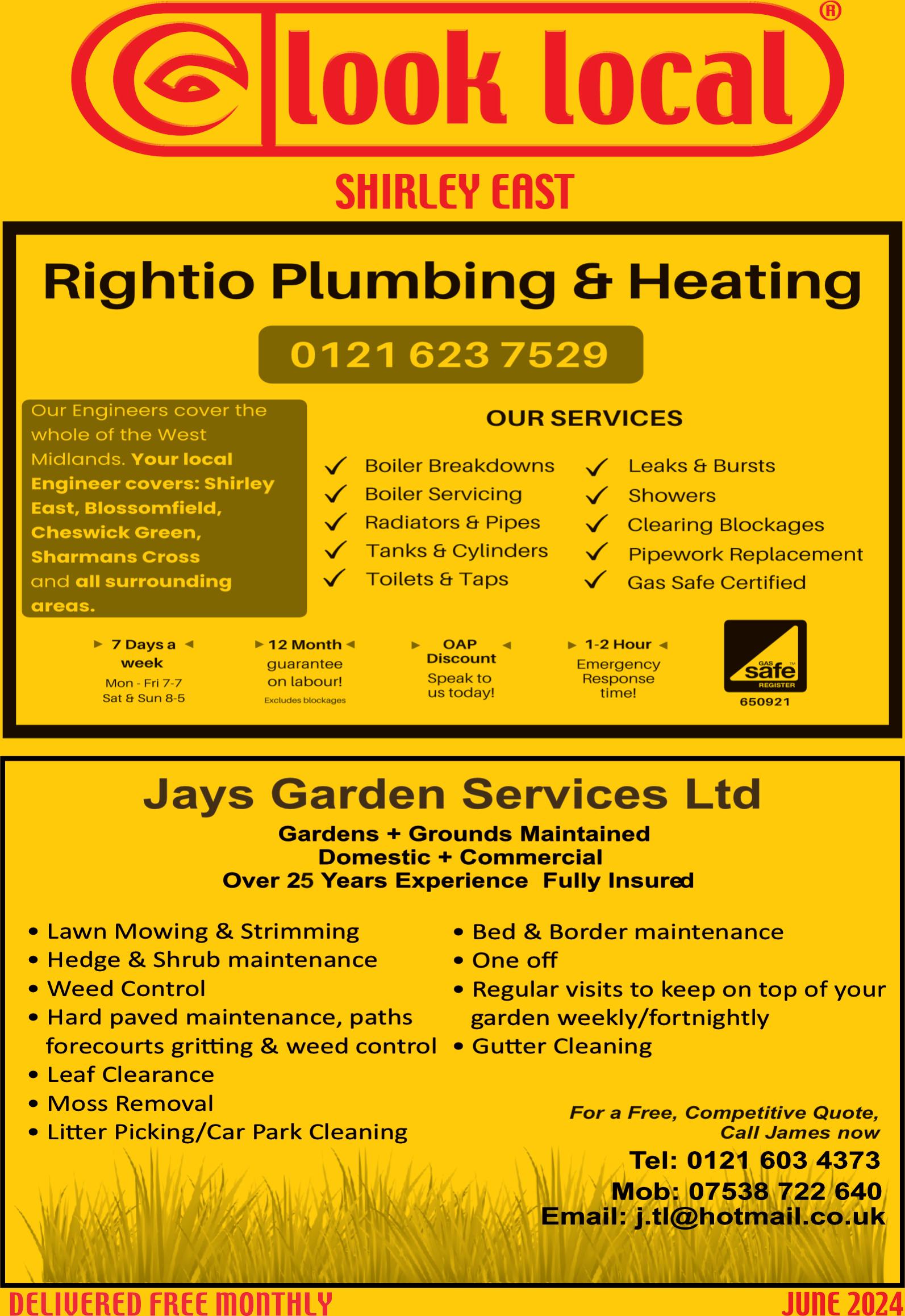 PLEASE MENTION ‘LOOK LOCAL’ WHEN RESPONDING TO ANY OF OUR ADVERTS NO CALL OUT CHARGE SENIOR CITIZEN & NHS DISCOUNTS BLOCKED DRAINS CLEARED FAST CALL OUR FRIENDLY TEAM 24/7 QUOTES & ADVICE FREE No1 PHD Ltd, Company No; 11927404, Reg. in England & Wales. Debit Drains Internal/External High Pressure Jetting Manual Rodding Pipe Laying Non Excavation Relining Insurance Work Undertaken CCTV Surveys No Additional Charges on evenings & weekends Fully Qualied Engineers covering your area Emergency Plumbing Blocked Toilets & Leaks 0121 673 8914 Excellent, May ‘24 D PLUMBING HEATING & DRAINAGE